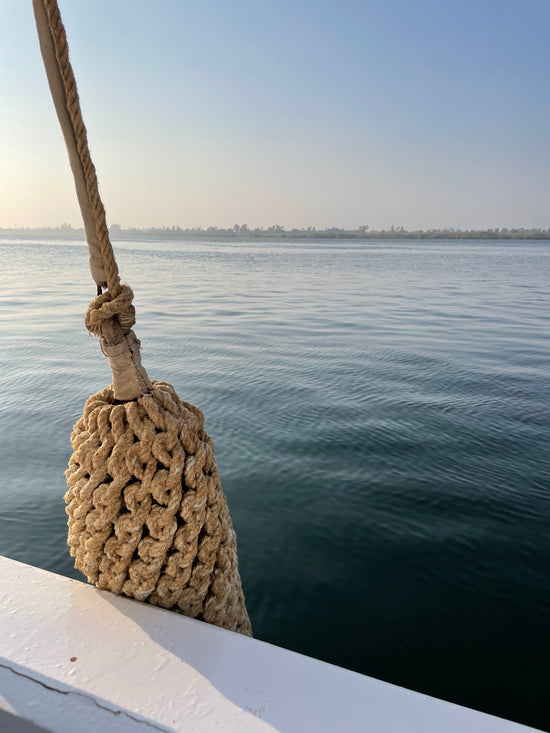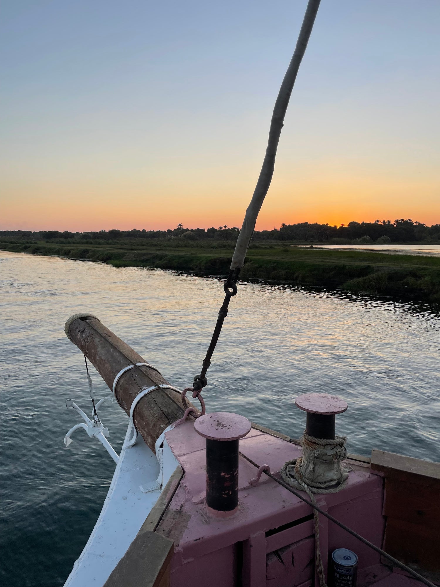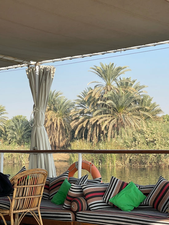 Embarcamos en Luxor rumbo a Asuán en la que será nuestra casa para los siguientes cinco días. La travesía es a bordo de un barco colonial con mucho encanto, decorado por su dueña, Eleonore, que ha mezclado estampados, texturas y fibras naturales para trasladar a la embarcación la autenticidad de Egipto. Despertarse y ver desde la ventana de tu camarote la estampa del oasis y las orillas del río es una experiencia extraordinaria. Como ver el sol esconderse entre las pirámides al atardecer bañando su perfil en luz anaranjada.