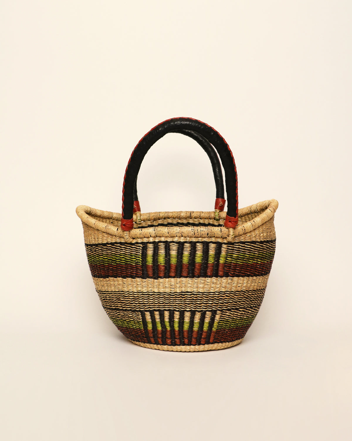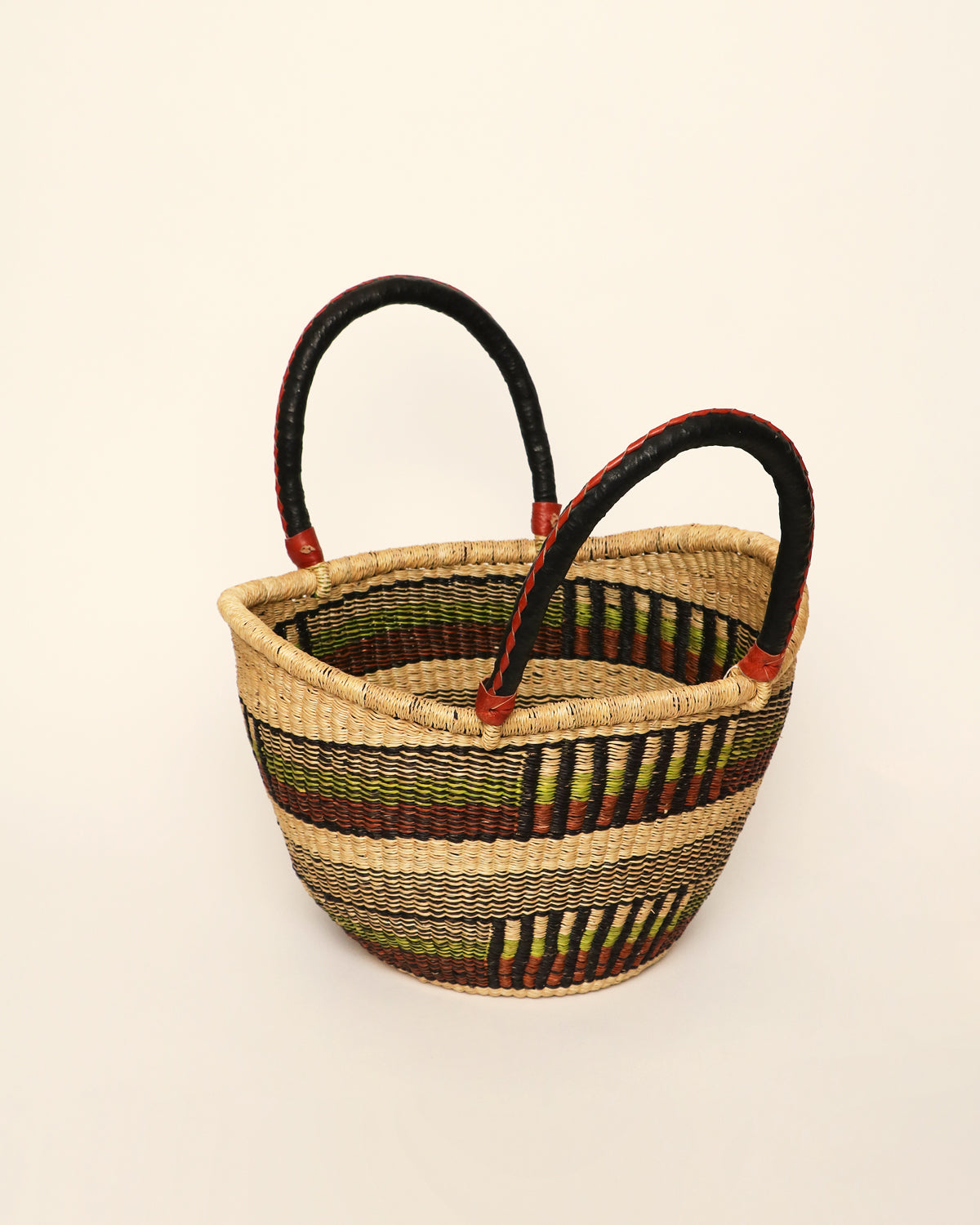 Handmade African basket in natural fibres with different patterns and colours and a leather covered handle.