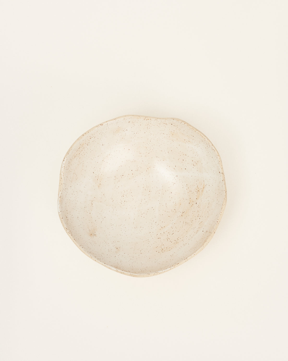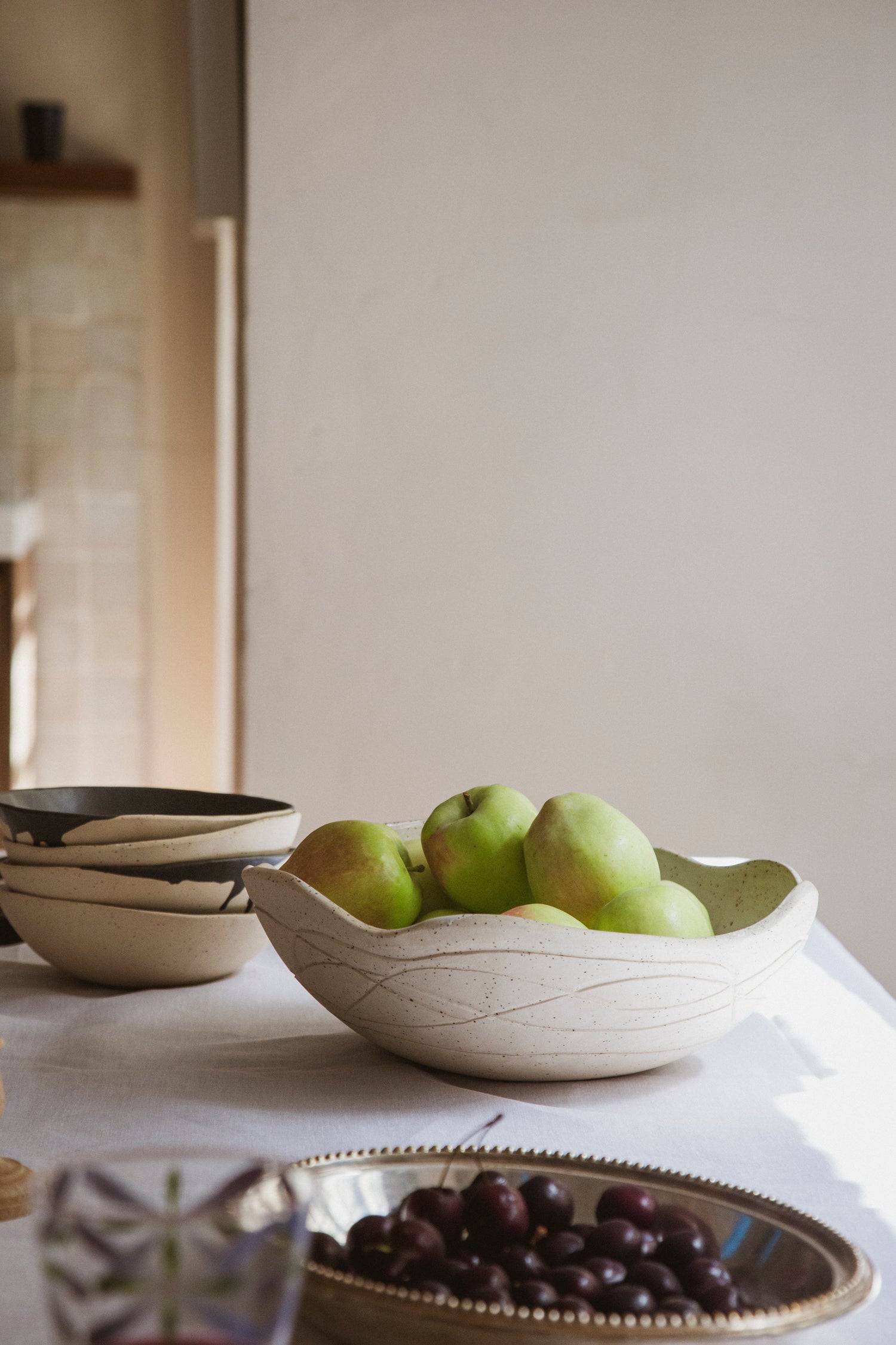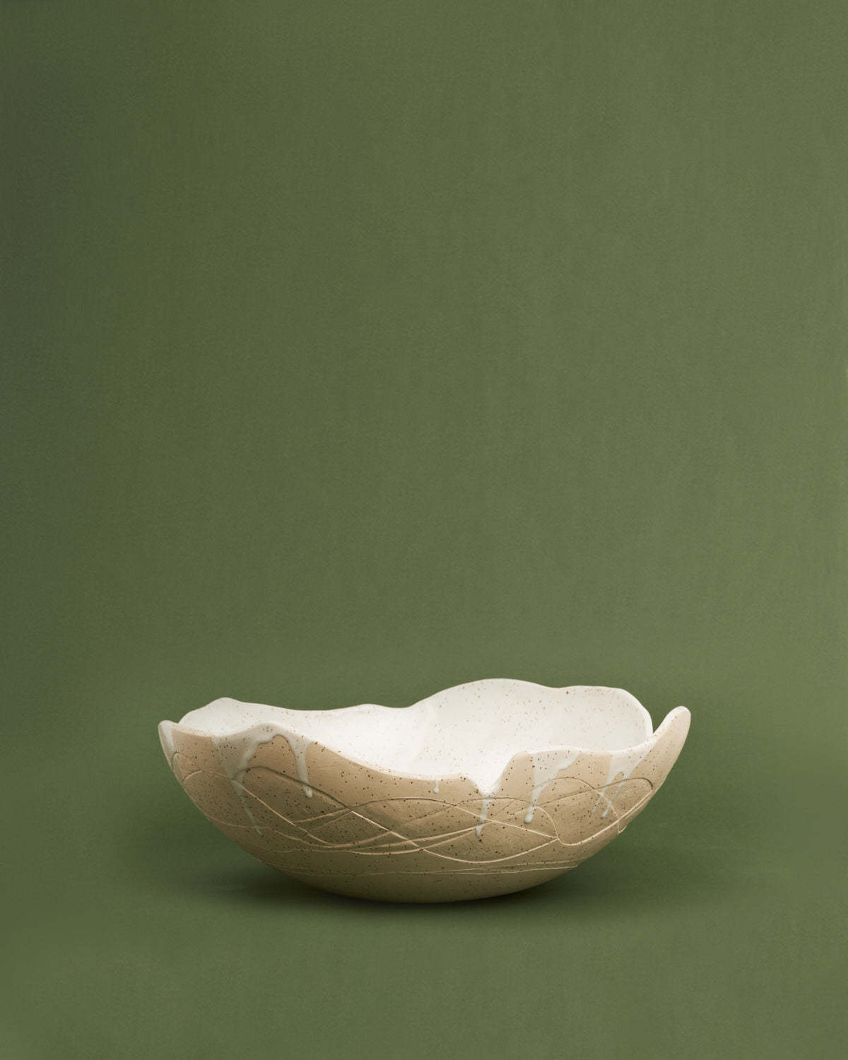 Beige fruit bowl with different designs that result from freely applying enamel by hand. Artisanal pottery made, painted and hand-carved in Madrid, Spain. The clay is porcelain stoneware with chamotte from Germany and the enamels are made in-house at their own studio using oxides, pigments and minerals. Each piece is unique.