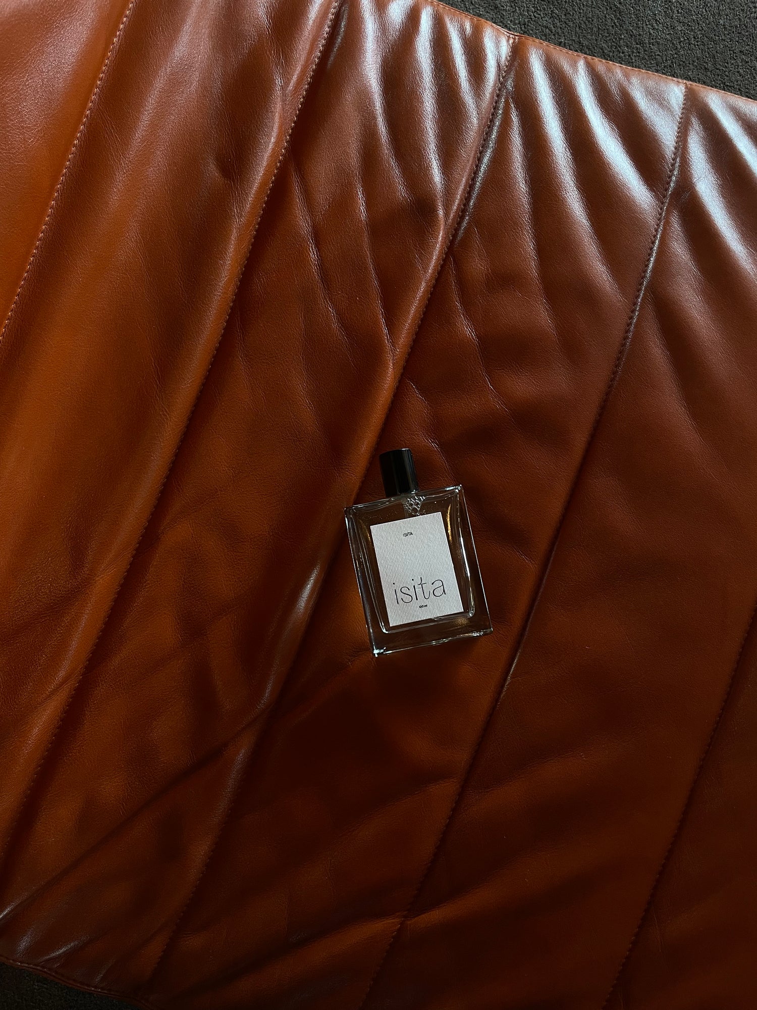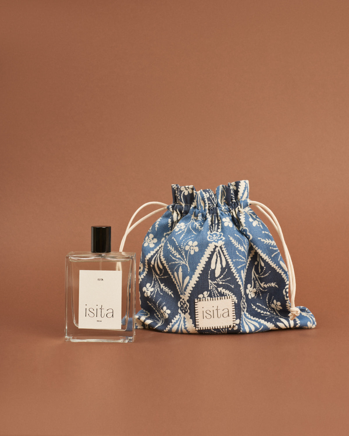 Home spray in a 100 ml glass bottle made in England. With a hand-painted pump and lid, and a parchment label. It comes in a pouch made from scraps of the fabrics we work with at Isita.