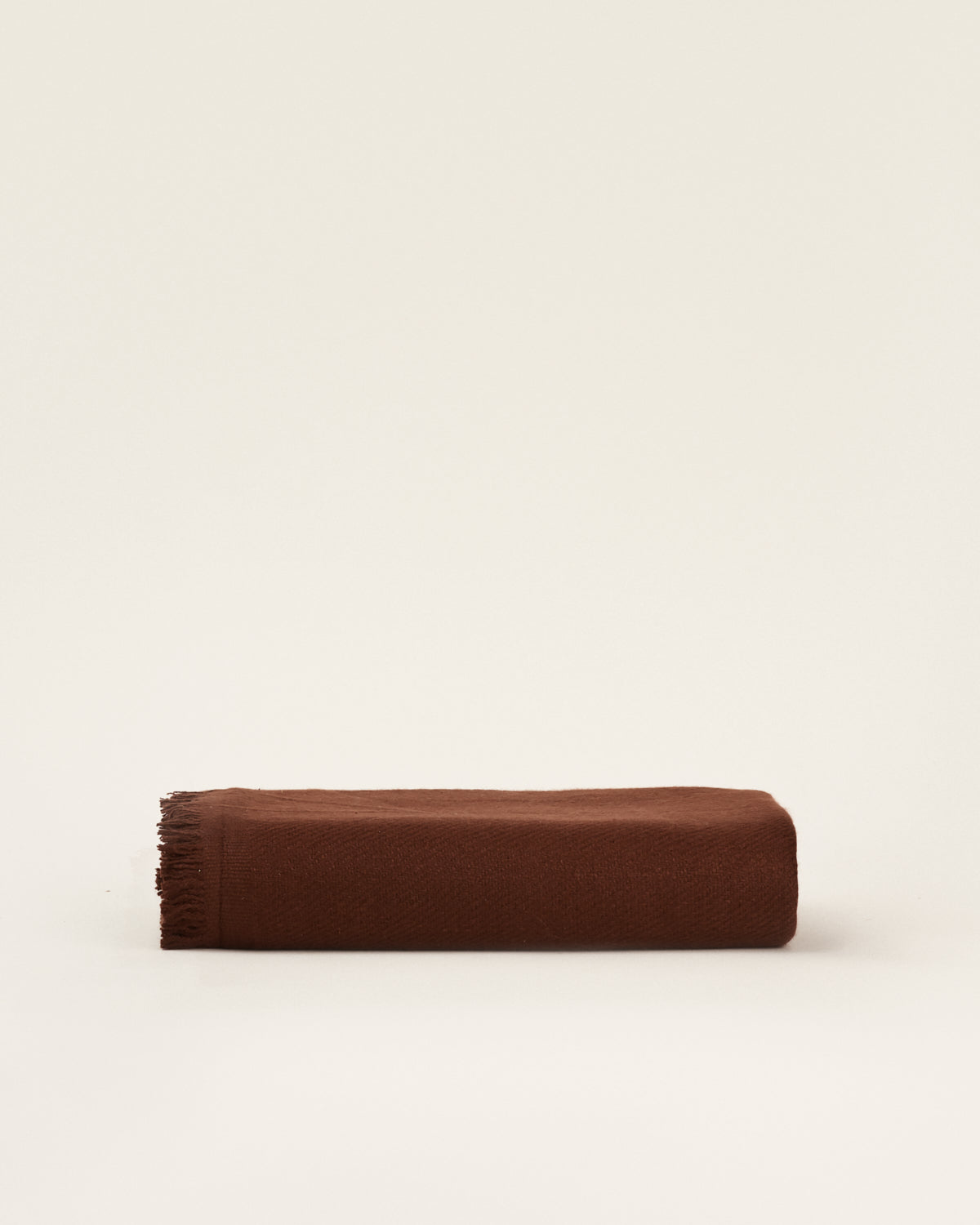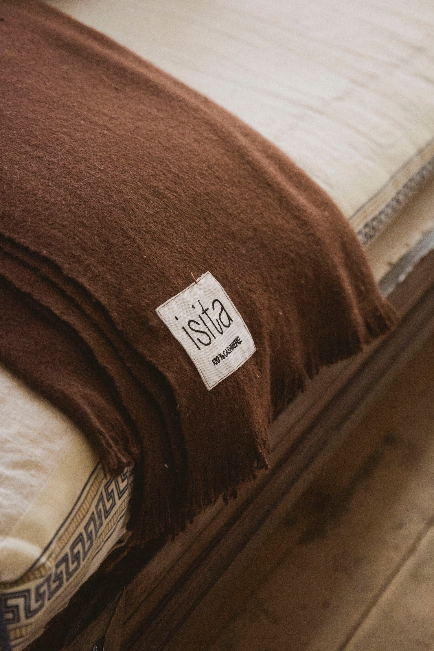 This soft cashmere blanket is made in India by women and hand-dyed with natural pigments. They take over three months to make. The fully artisanal production process is carried out in a small workshop in Srinagar, in the Kashmir Valley on the banks of the Jhelum River. There, they have been working with this exclusive wool for five generations. The quality of the fibre, from the Ladakh region, is the best in the world with an average grade of 14 microns. The blankets come in six bright and timeless colours, all finished with a fringe border, a modern classic to embrace and be embraced with.