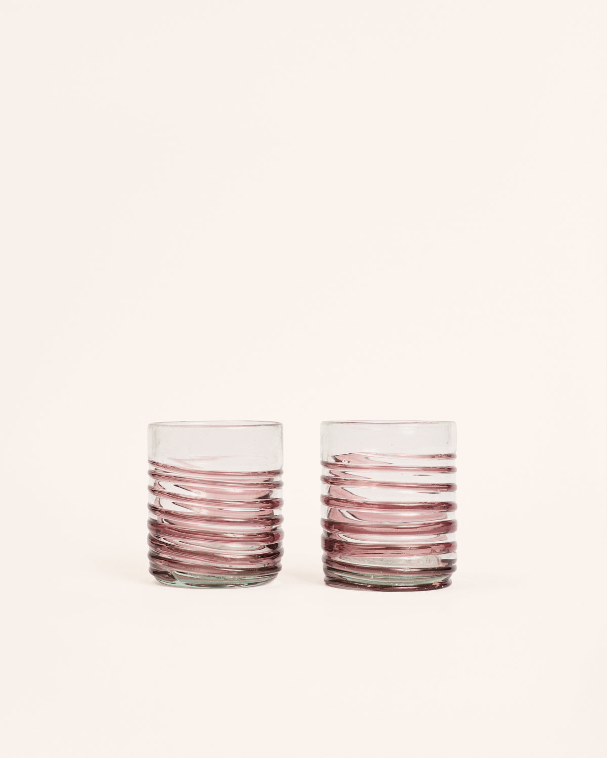 Set of 2 Mediterranean style glasses with a spiral design in amethyst. Hand blown glass made in Mallorca. The slight differences and irregularities in design and finish are part of the unique character and charm of the craftsmanship. No two pieces are alike, they are all different and exclusive.