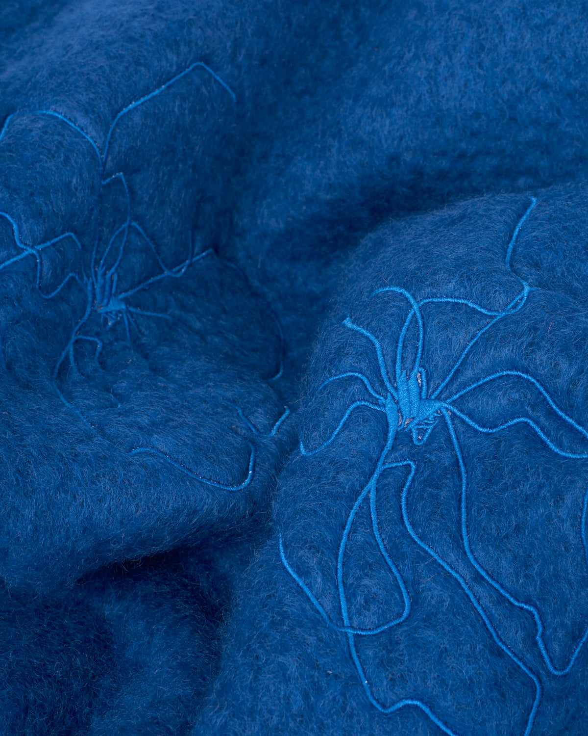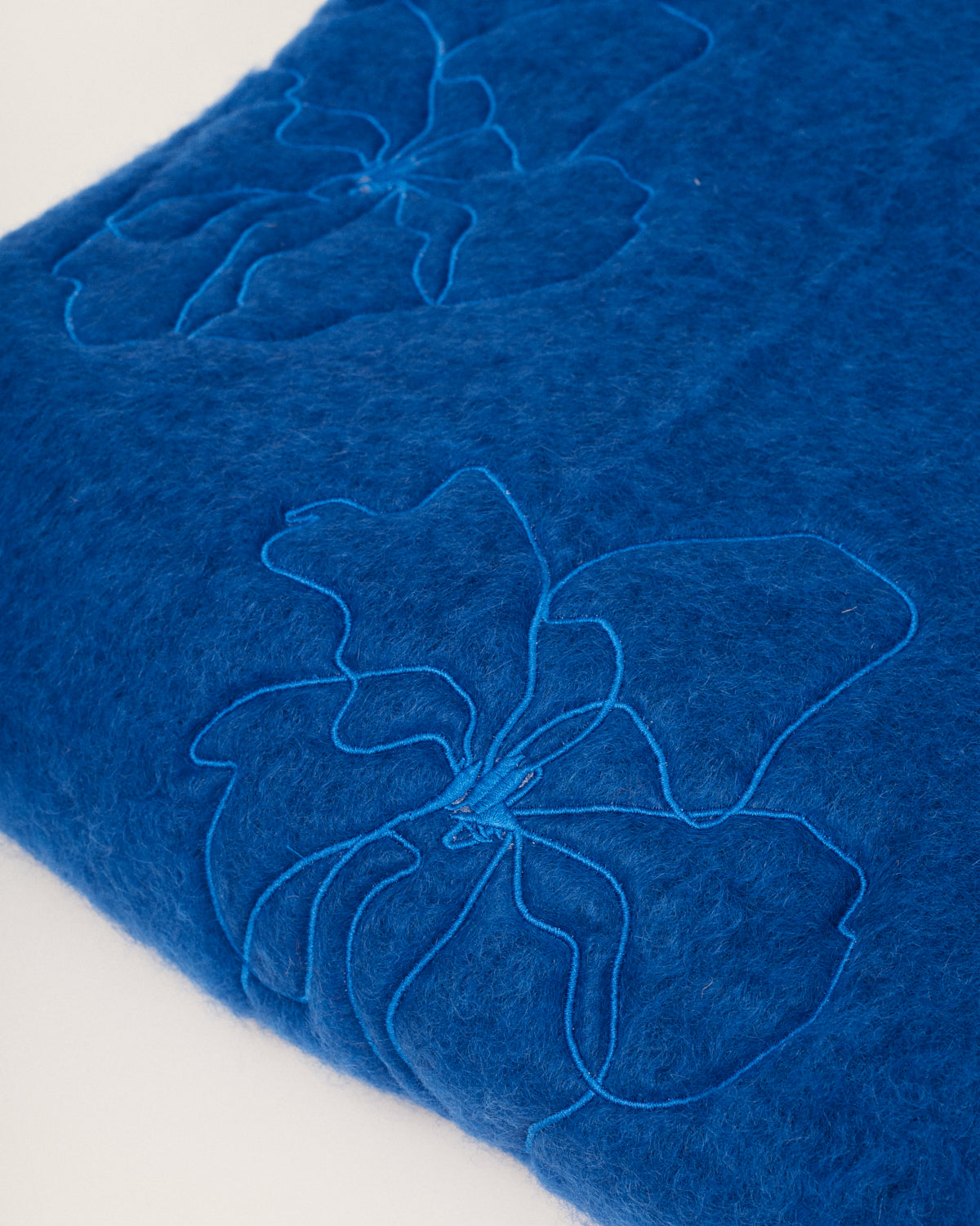 Mohair blanket handmade in La Rioja, Spain. A family business that has been producing mohair among other materials since 1930. It has an embroidery of two lilium flowers designed by Isita and previously hand drawn by Álvaro Llanza. We chose these colours because it reminded us of the colours of nature, the wild fields and those spring summer evenings in the north...