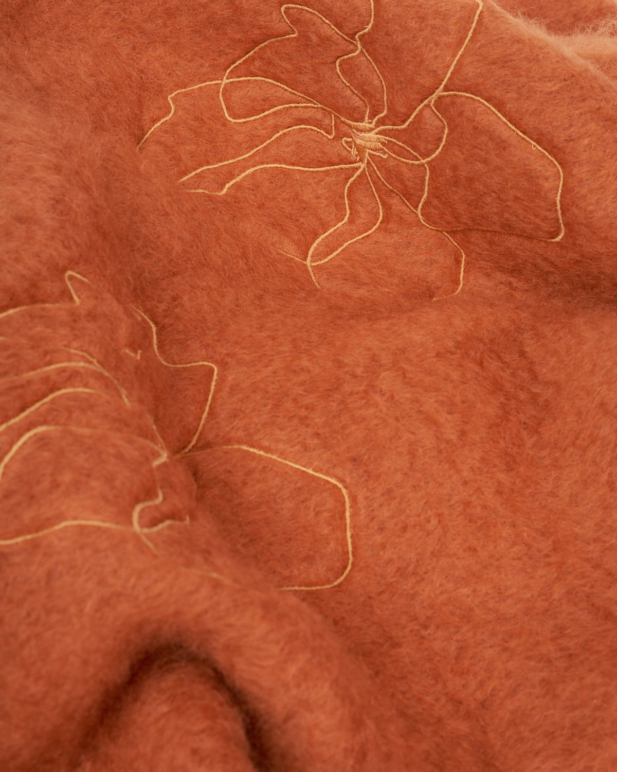 Mohair blanket handmade in La Rioja, Spain. A family business that has been producing mohair among other materials since 1930. It has an embroidery of two lilium flowers designed by Isita and previously hand drawn by Álvaro Llanza. We chose these colours because it reminded us of the colours of nature, the wild fields and those spring summer evenings in the north ....Mohair blanket handmade in La Rioja, Spain, in a family business that has been producing mohair among other materials since 1930. Embroidered in Madrid with two lilium flowers designed by Isita and previously hand drawn by Álvaro Llanza. We chose these colours because it reminded us of the colours of nature, of wild fields and those spring and summer evenings in the north...