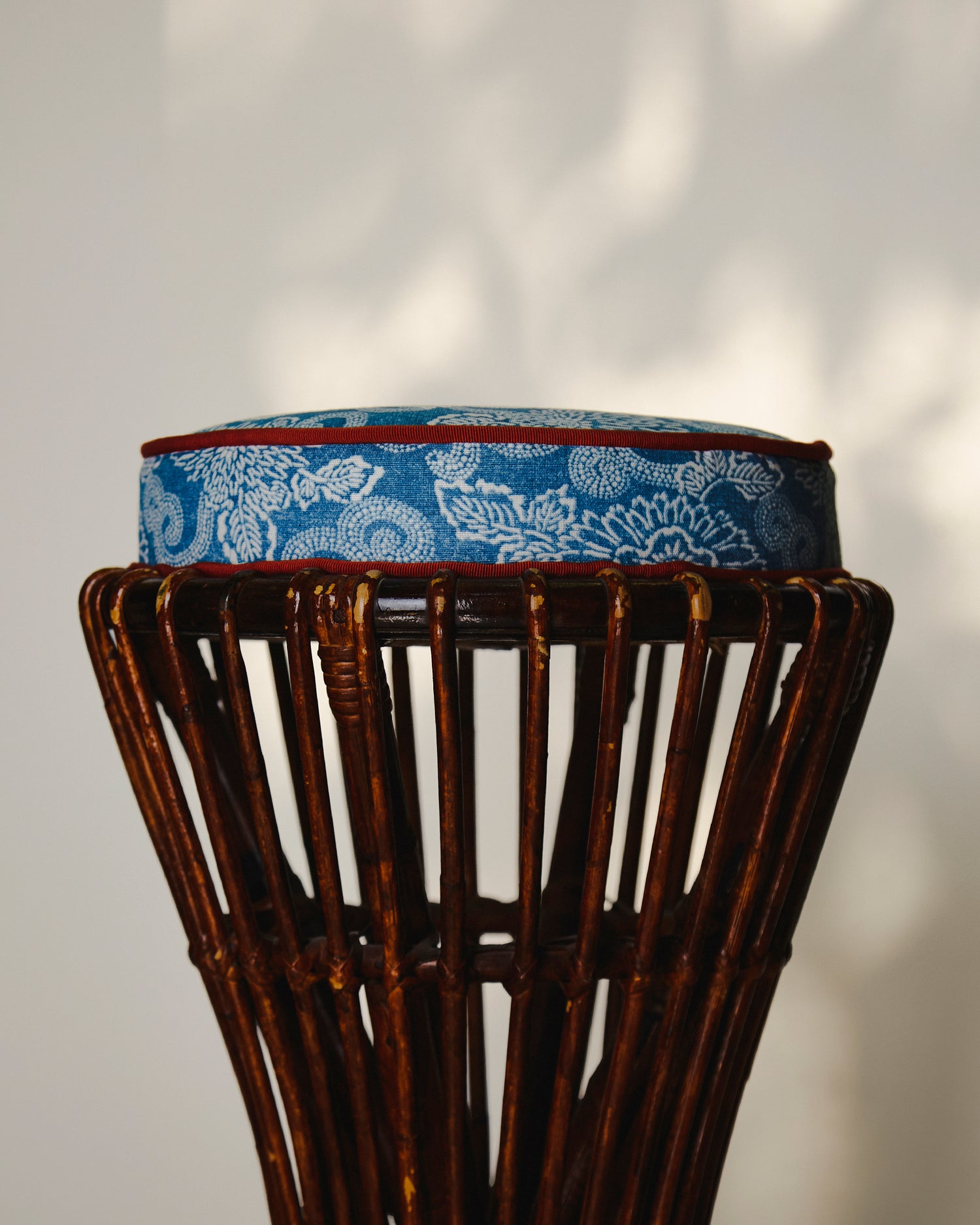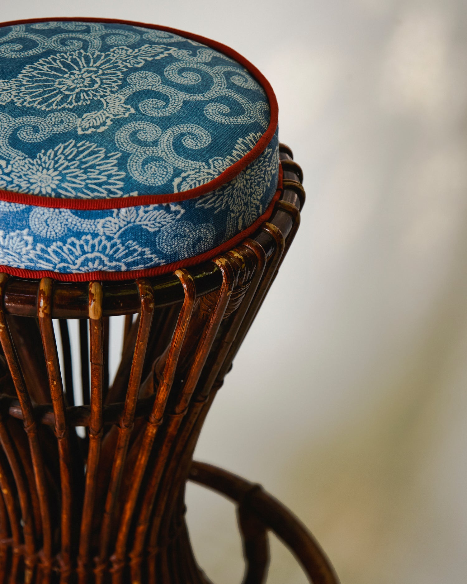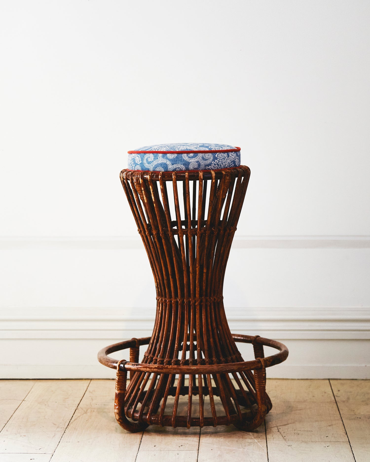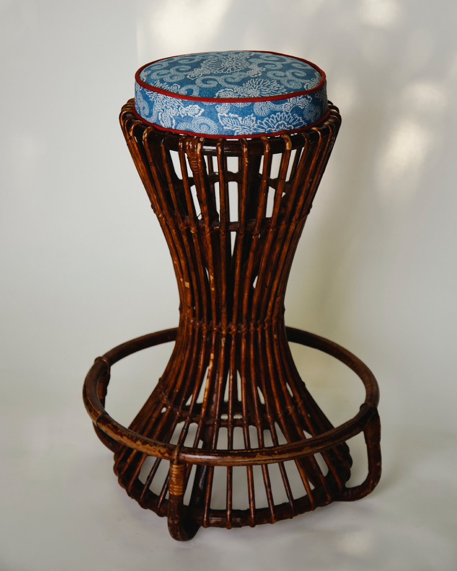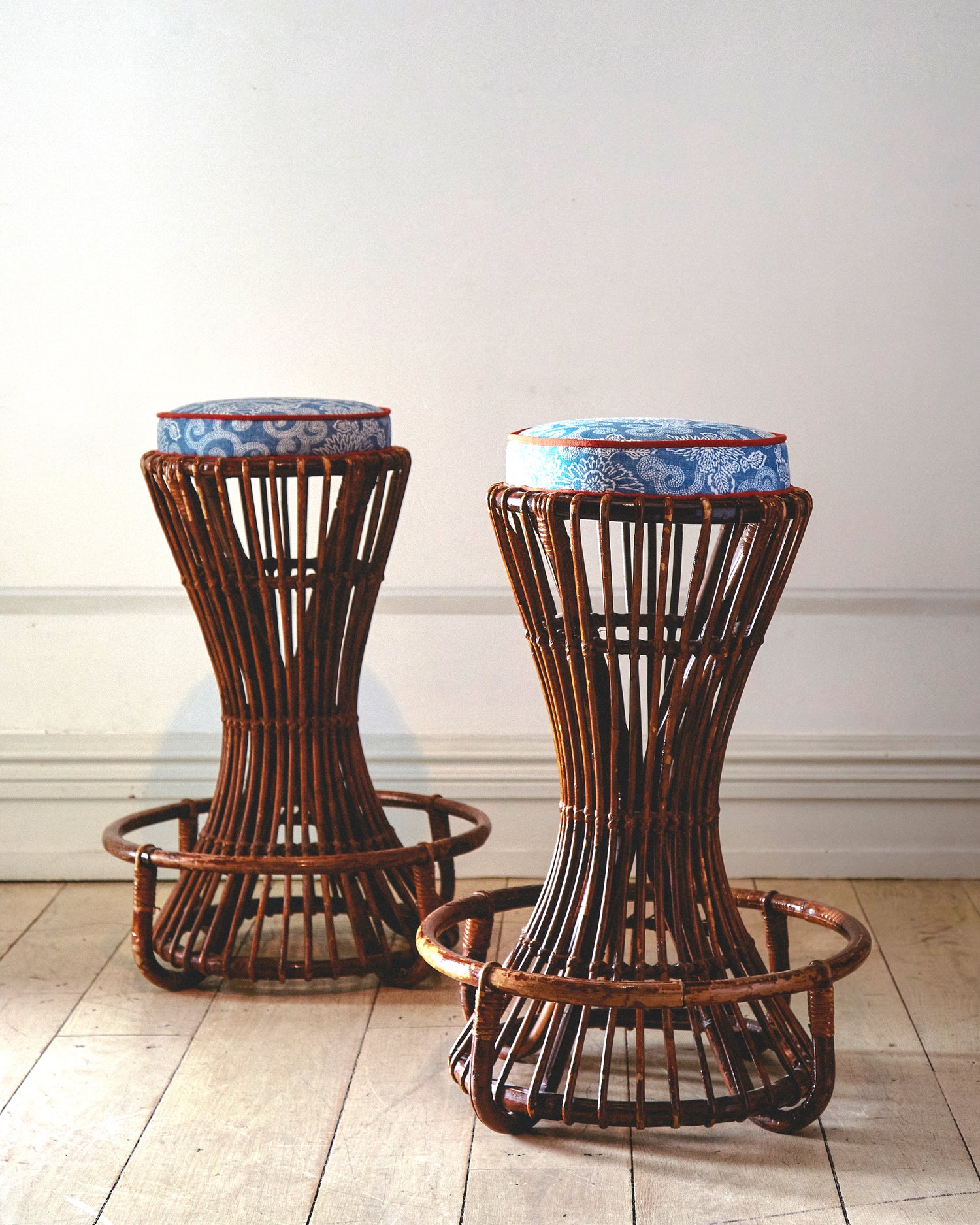 Rattan bar stools by Tito Agnoli for Bonacina 1955. Structurally solid and in good usable condition. The seats are upholstered in blue linen fabric with a flower print and bright orange grosgrain.