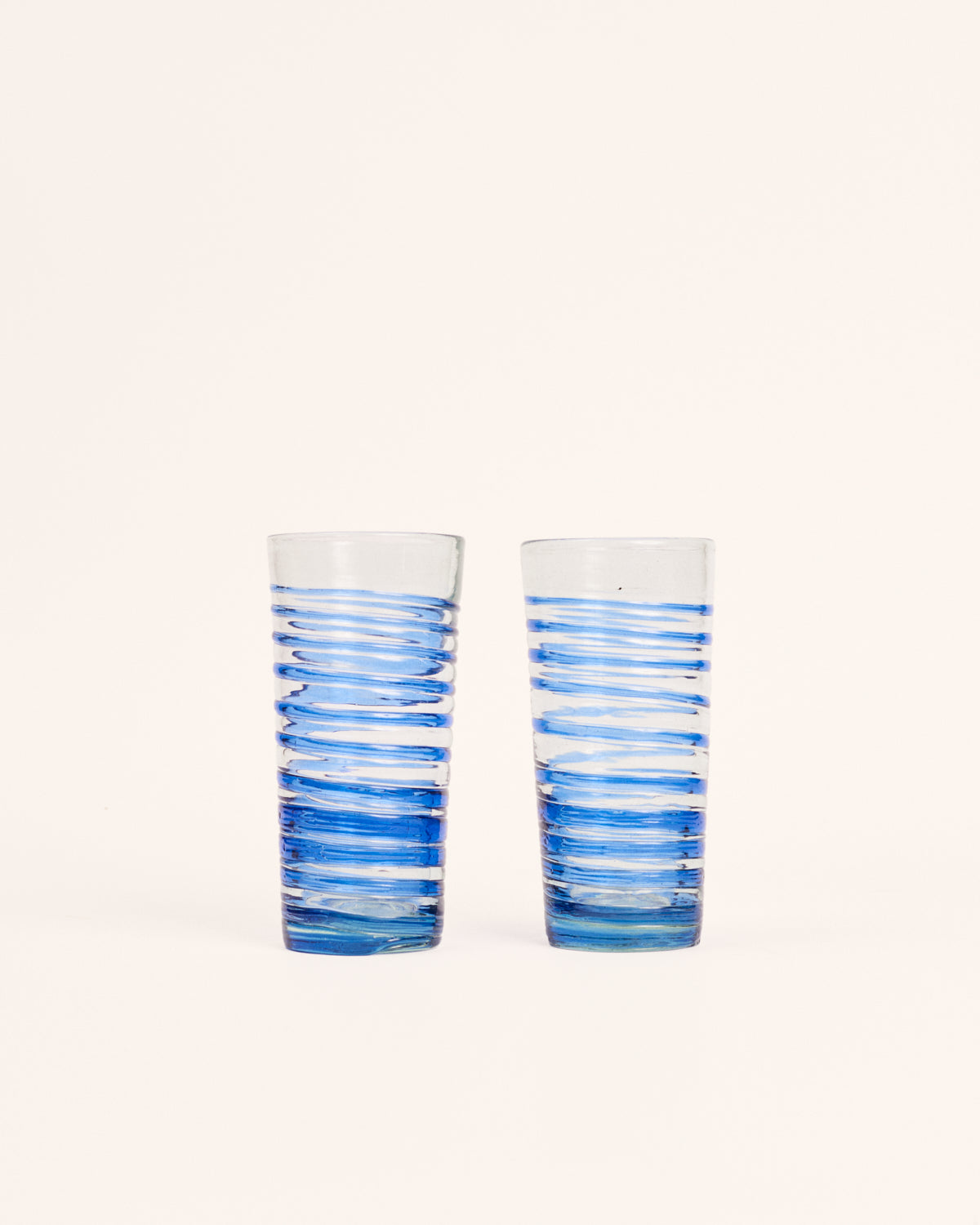 Set of 2 Mediterranean style glasses with a spiral design in bllue. Hand blown glass made in Mallorca. The slight differences and irregularities in design and finish are part of the unique character and charm of the craftsmanship. No two pieces are alike, they are all different and exclusive.