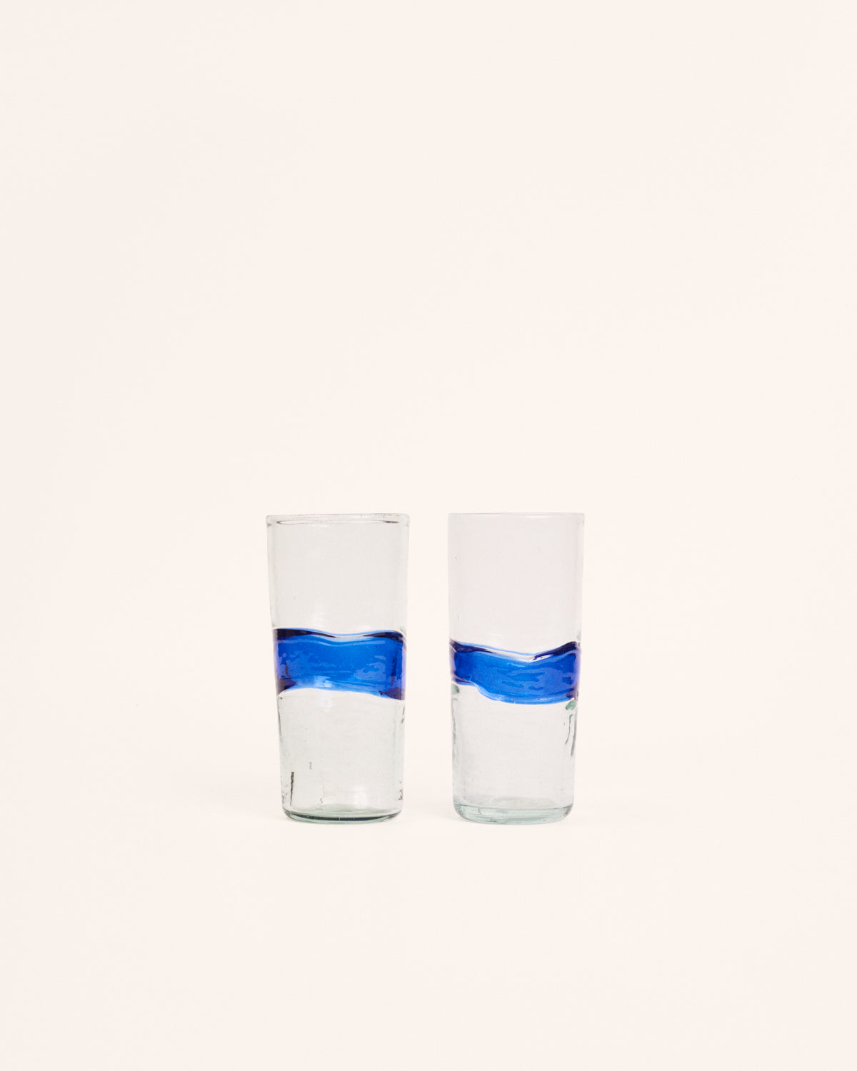 Set of 2 Mediterranean style glasses with a central border in blue. Hand blown glass made in Mallorca. The slight differences and irregularities in design and finish are part of the unique character and charm of the craftsmanship. No two pieces are alike, they are all different and exclusive.