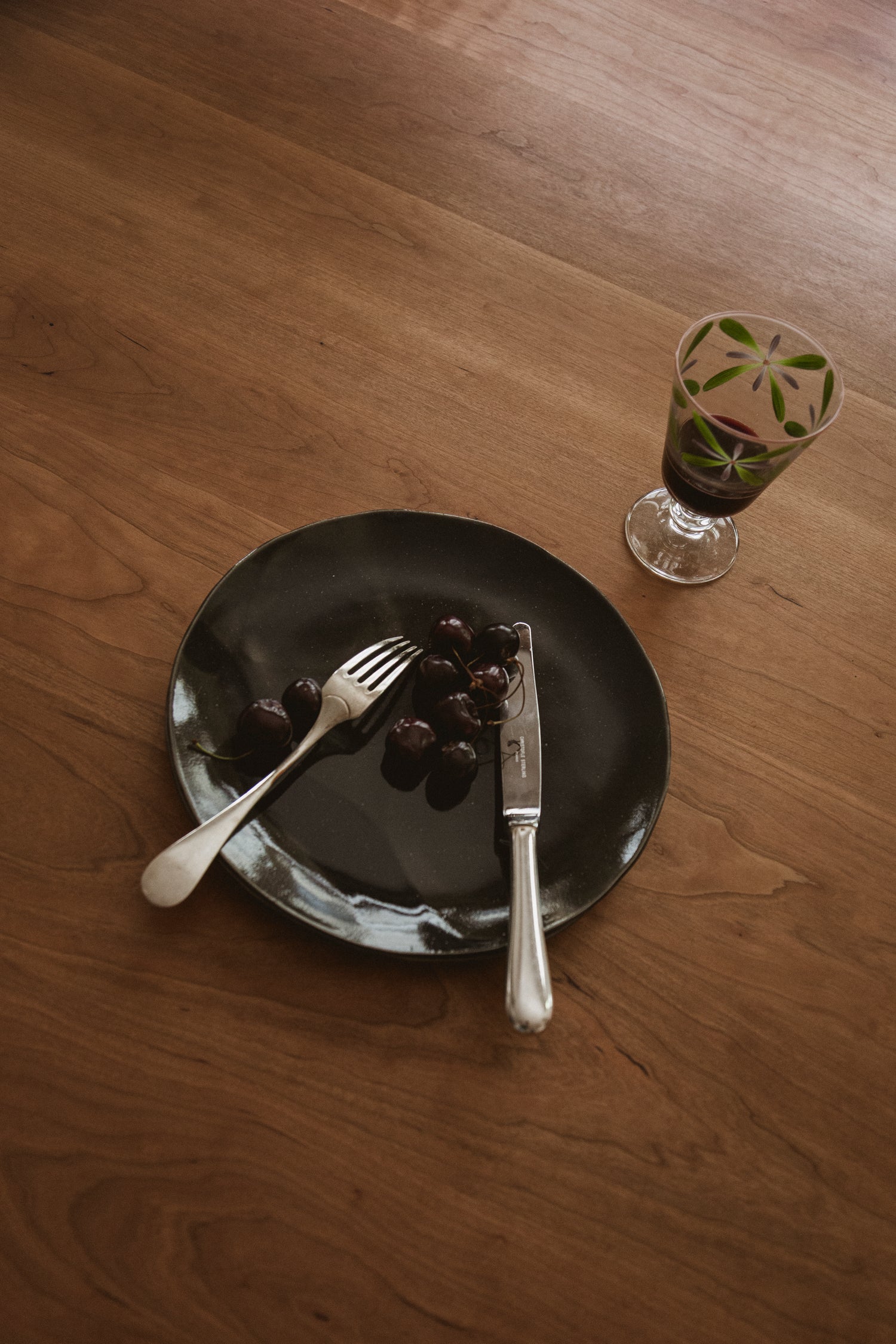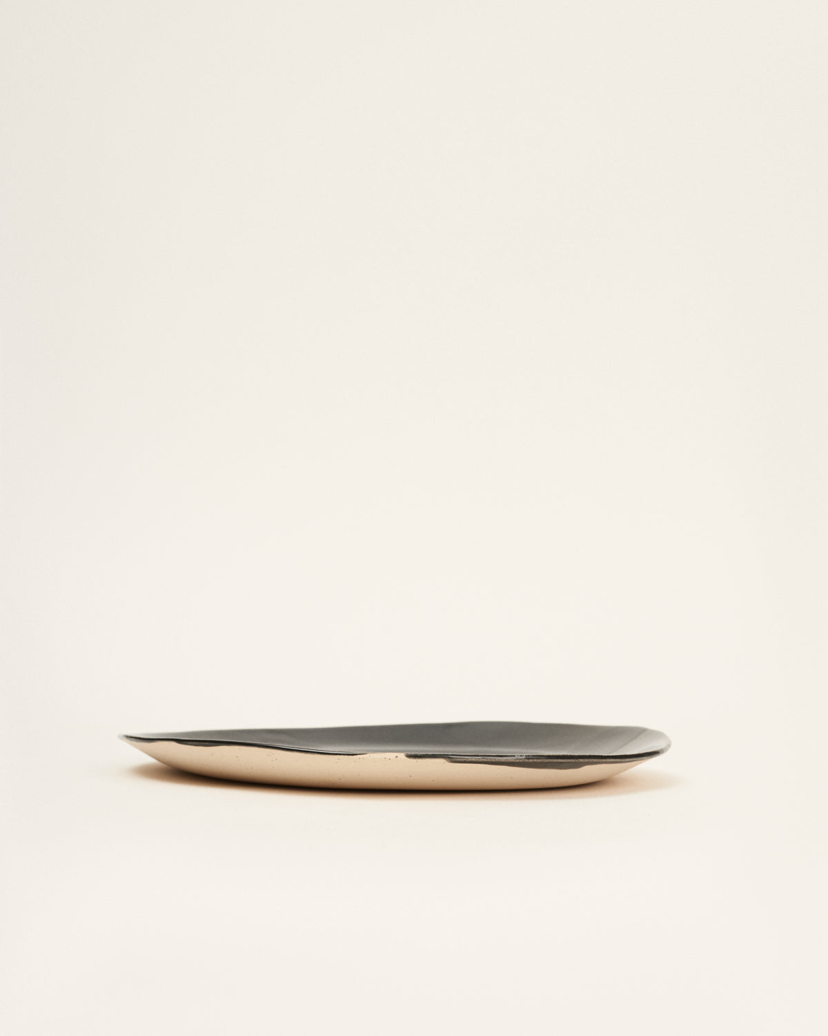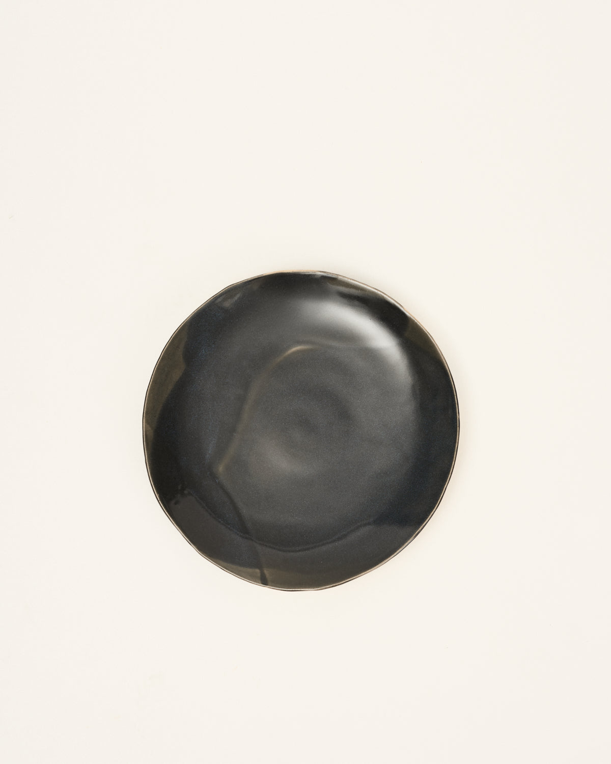 Set of two large dinner plates in glossy black. With different designs that result from freely applying enamel by hand. Artisanal pottery made and painted by hand in Madrid, Spain. The clay is porcelain stoneware with chamotte from Germany and the enamels are made in-house at their own studio using oxides, pigments and minerals. Each piece is unique.