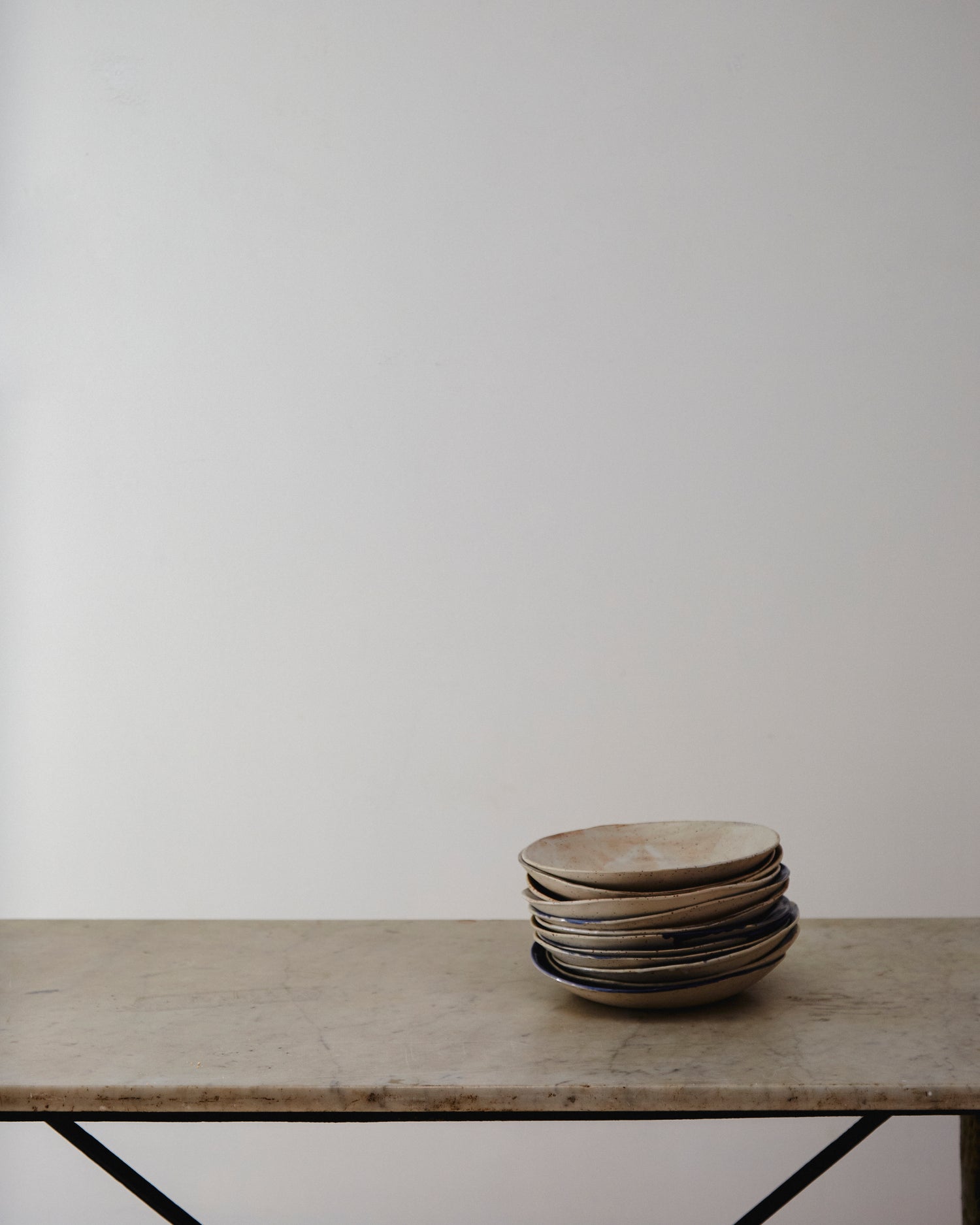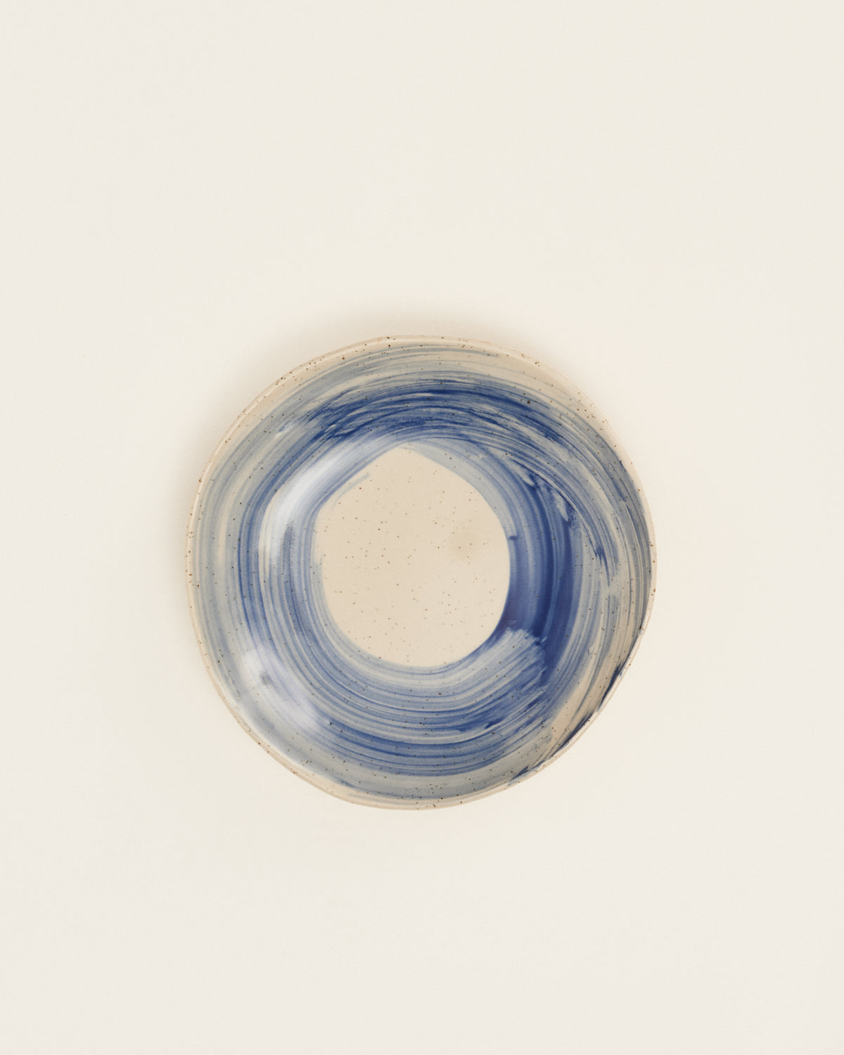 Set of two side plates in glossy beige with brushstrokes of Klein blue. Artisanal pottery made and painted by hand in Madrid, Spain. The clay is porcelain stoneware with chamotte from Germany and the enamels are made in-house at their own studio using oxides, pigments and minerals.