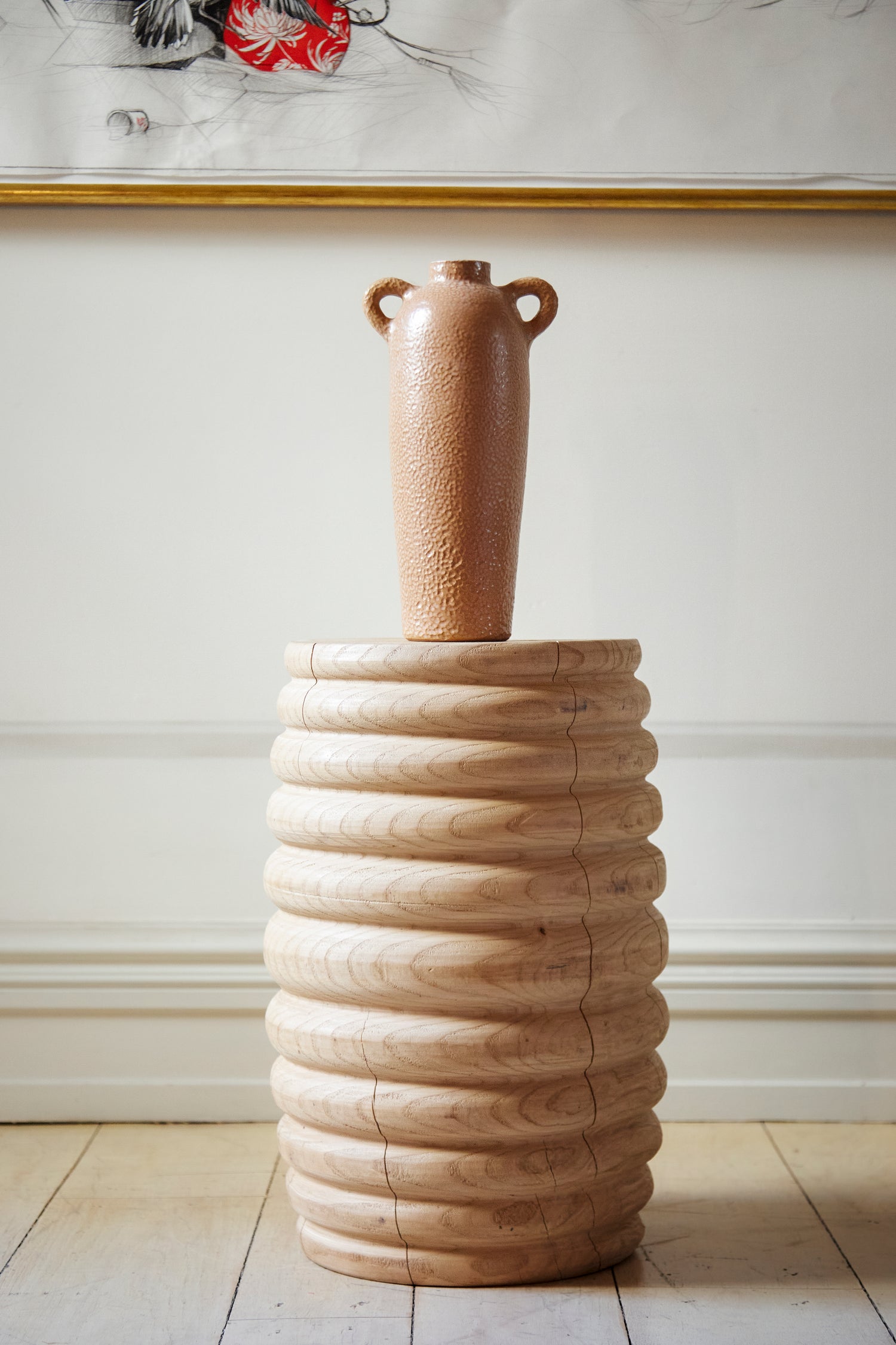 Ánfora de cerámica moldeada y pintada a mano por Ladio Ceramics en su taller de Ibiza, España. Diseño tradicional y mediterráneo en terracota clara esmaltada transparente en exterior y gris perla en interior. Con asas y diversas texturas y acabados. Disponible como pieza única. Se puede combinar con los otros modelos de la misma familia para componer un set. Todos son diferentes.