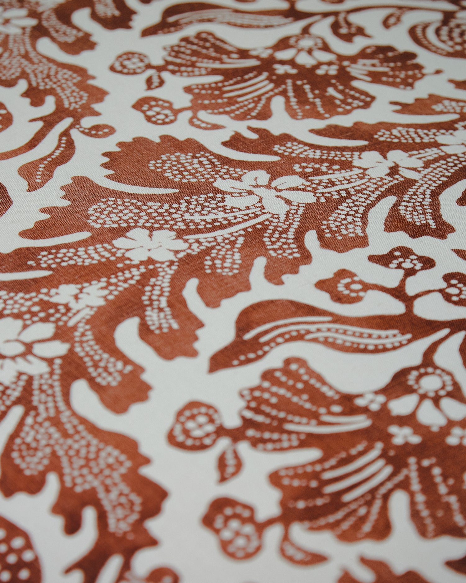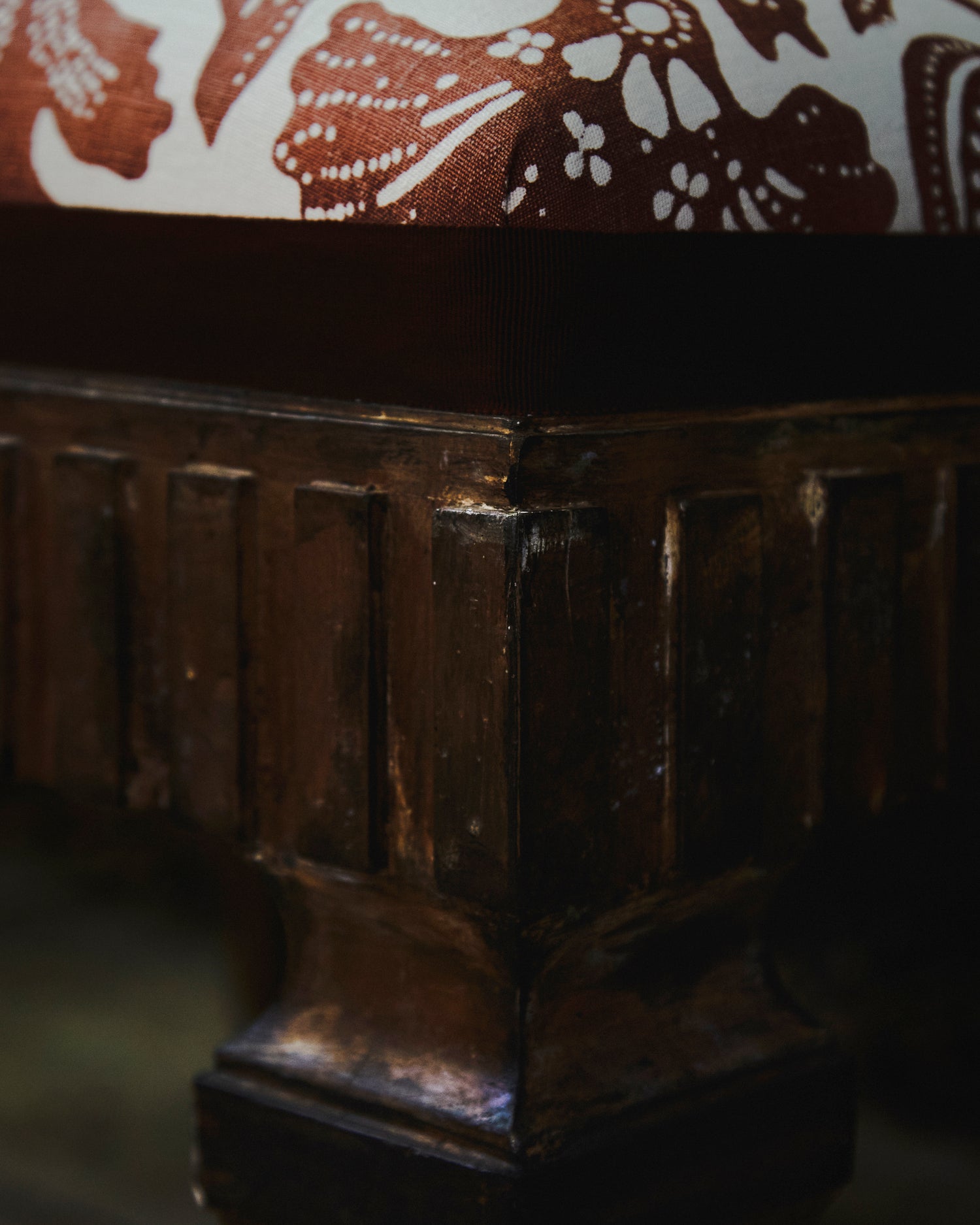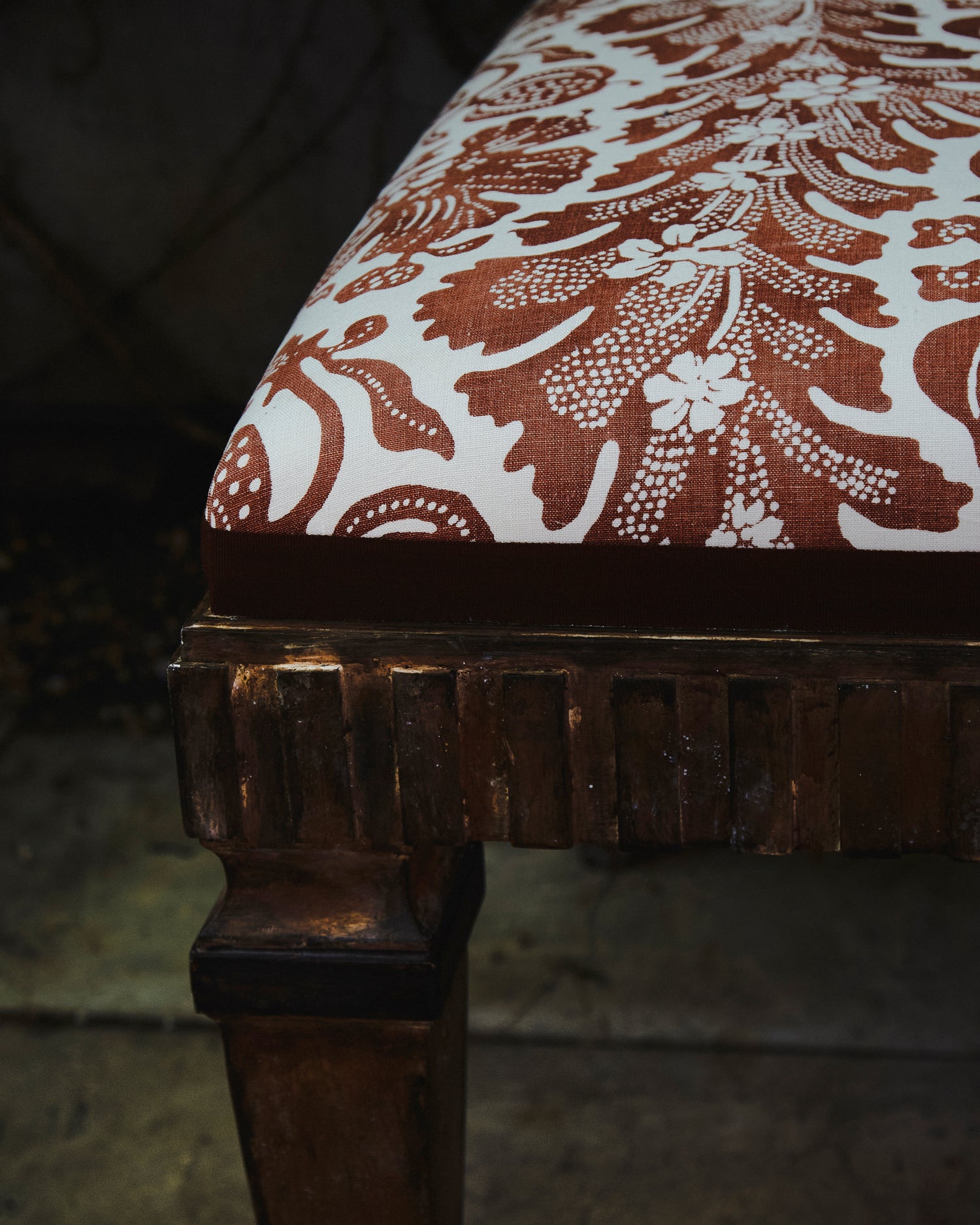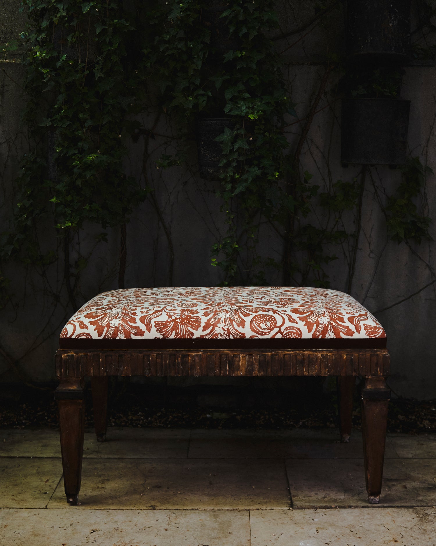 Banqueta tapizada en tela de estampado floral y cinta grosgrain en tonos teja. Se puede comprar la pareja.