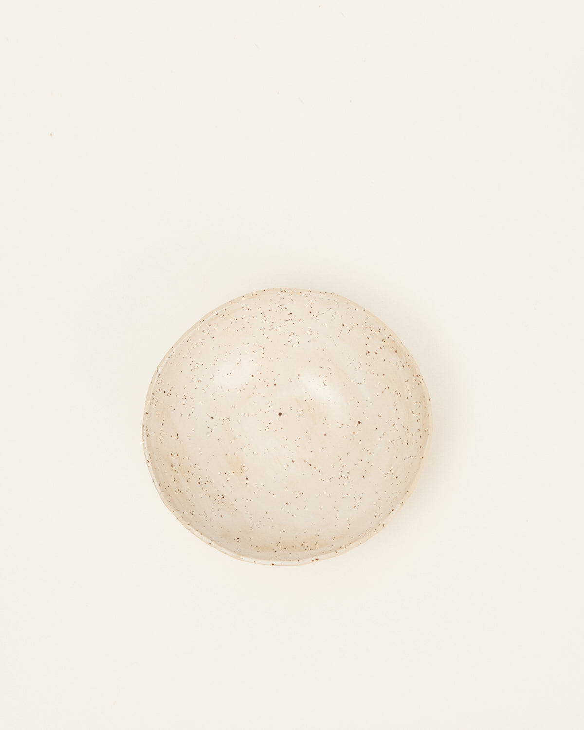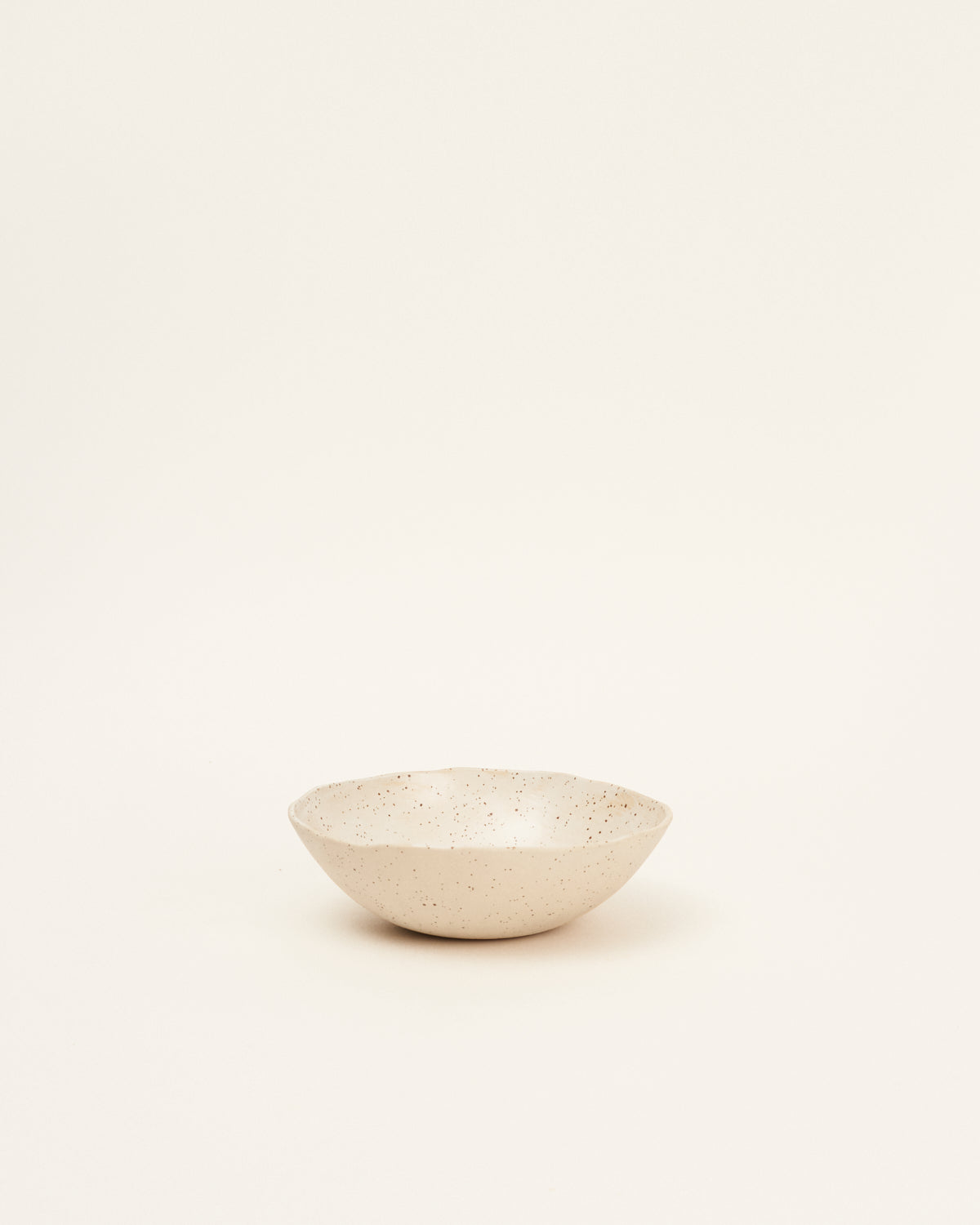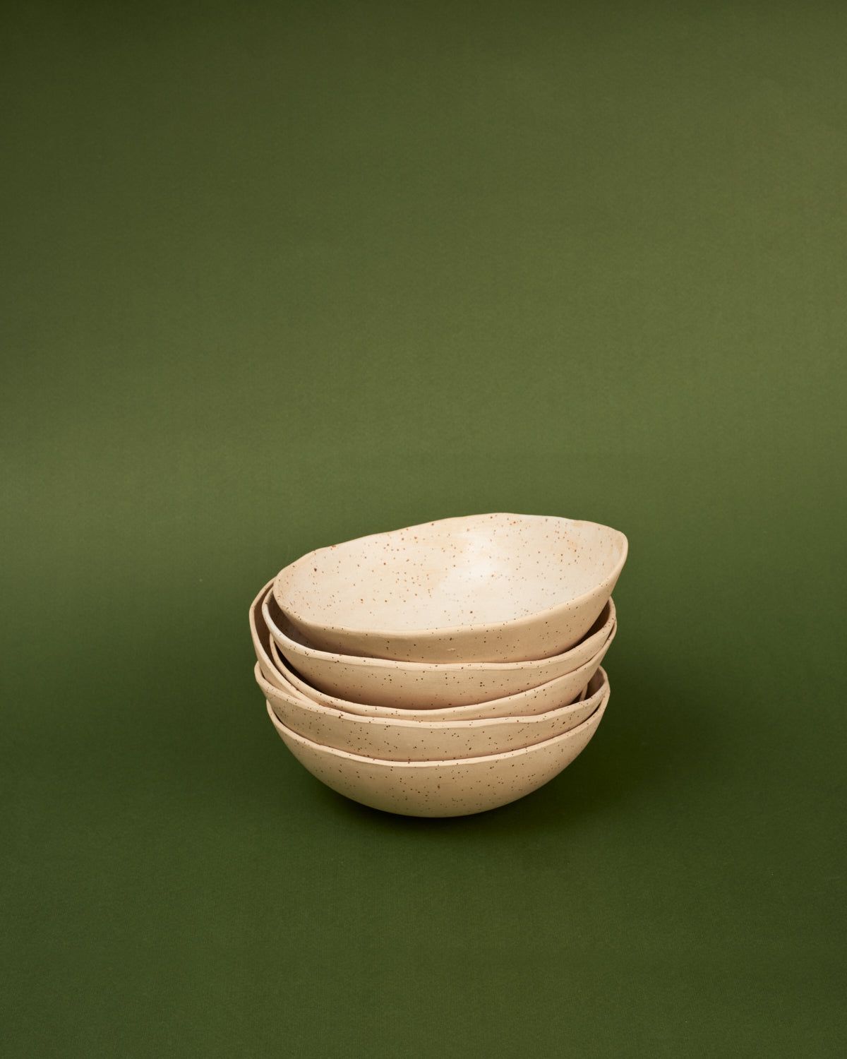 Set de 2 bowls color beige con diferentes dibujos surgidos de la aplicación libre y manual del esmalte. Cerámica artesanal fabricada y pintada a mano en Madrid, España. La arcilla es un gres porcelánico con chamota procedente de Alemania y los esmaltes son formulados en su taller utilizando óxidos, pigmentos y minerales. Cada pieza es única.
