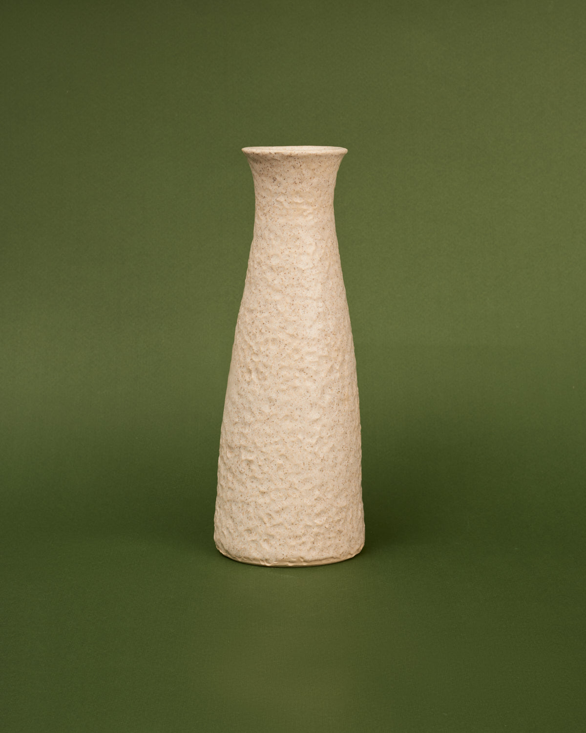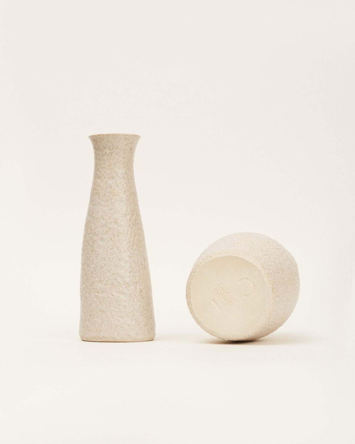 Jarrón de cerámica moldeada y pintada a mano por Ladio Ceramics en su taller de Ibiza, España. Diseño tradicional y mediterráneo en gres y colores naturales: blanco roto, ocre y gris. Disponible como pieza única. Se puede combinar con los otros modelos de la misma familia para componer un set. Todos son diferentes.