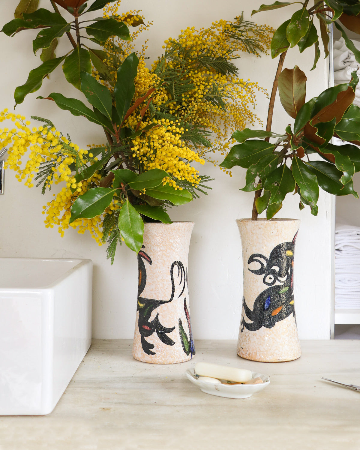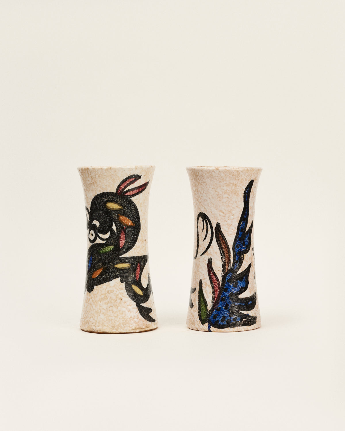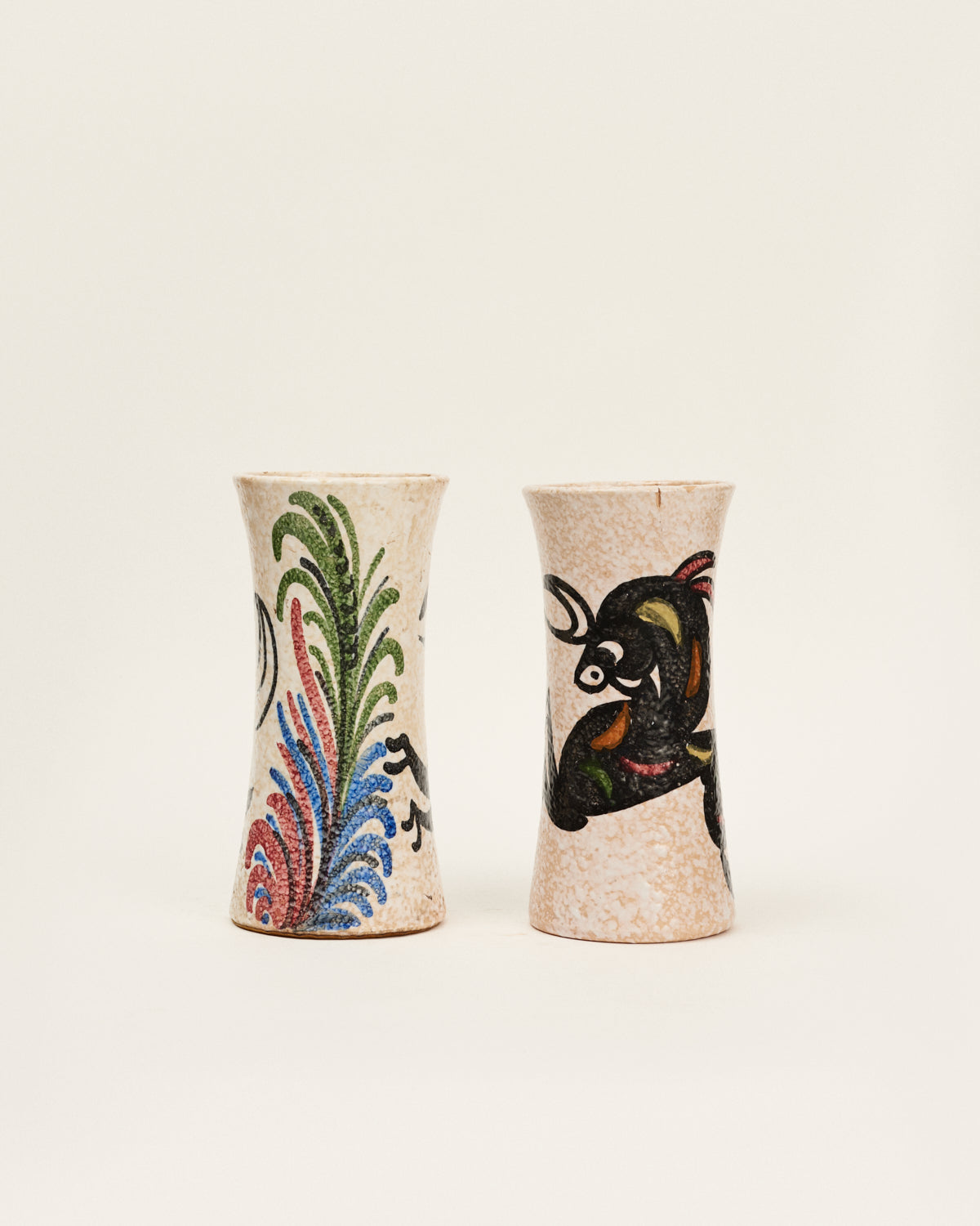 Pareja de jarrones de cerámica de El Puente del Arzobispo, localidad manchega próxima a Talavera de la Reina (Toledo). Segunda mitad del siglo XX. Loza mayólica: arcilla decorada con esmaltes metálicos. Este tipo de cerámica es conocida por sus dibujos de animales (como toros, gallos, vacas) y paisajes.
