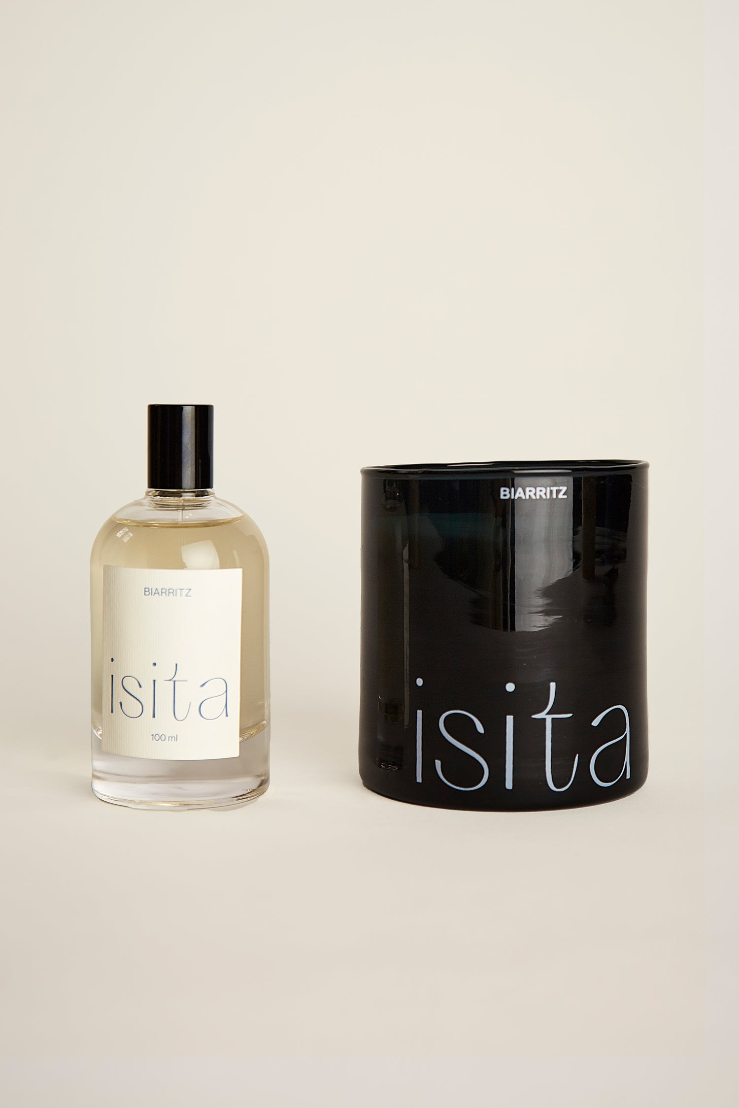 Home spray fabricado en frasco de vidrio de 100 mL con bomba y tapón pintados a mano y etiqueta de papel vegetal. Viene en una caja de cartón con estampados diseñados por Isita.