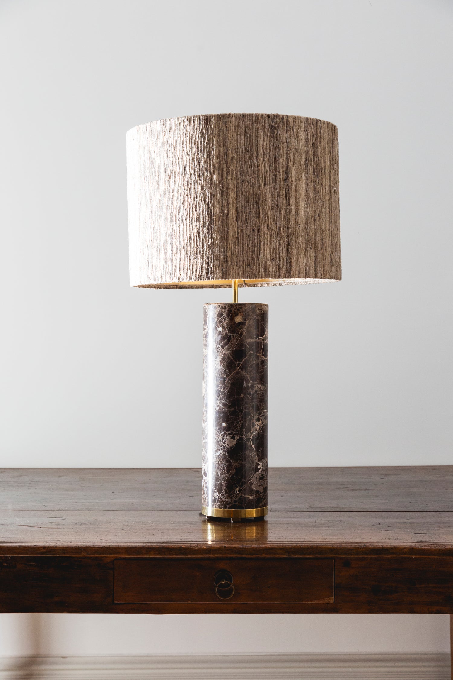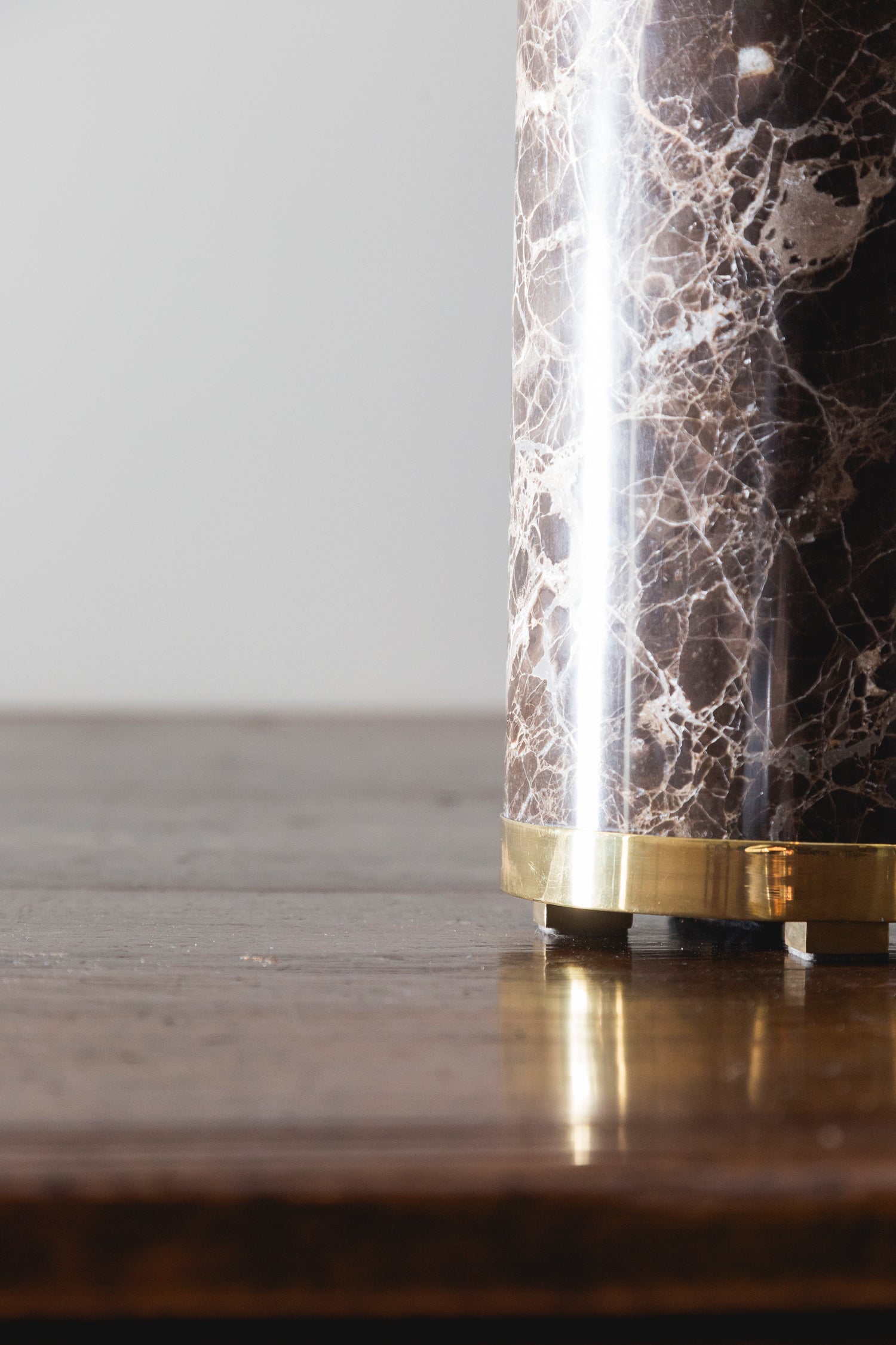 Pie de lámpara de mármol marrón emperador con cinturones de latón arriba y abajo. Lo puedes combinar con cualquiera de nuestras pantallas. Cada pieza está hecha a mano en España y diseñada exclusivamente para Isita.