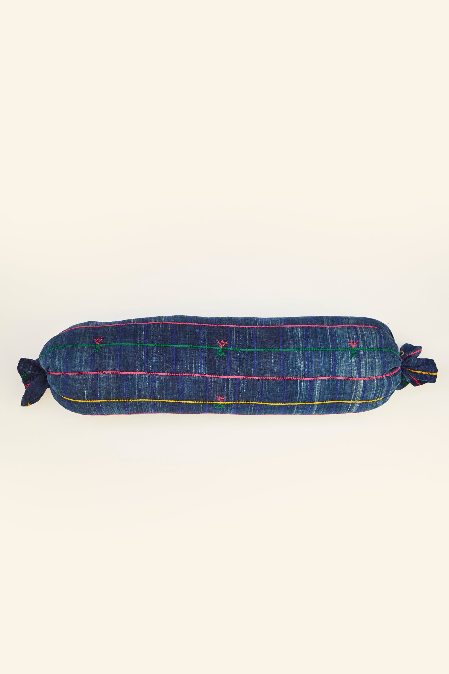 Almohadón de estilo rulo en tela de color índigo con rayas de colores antigua africana.