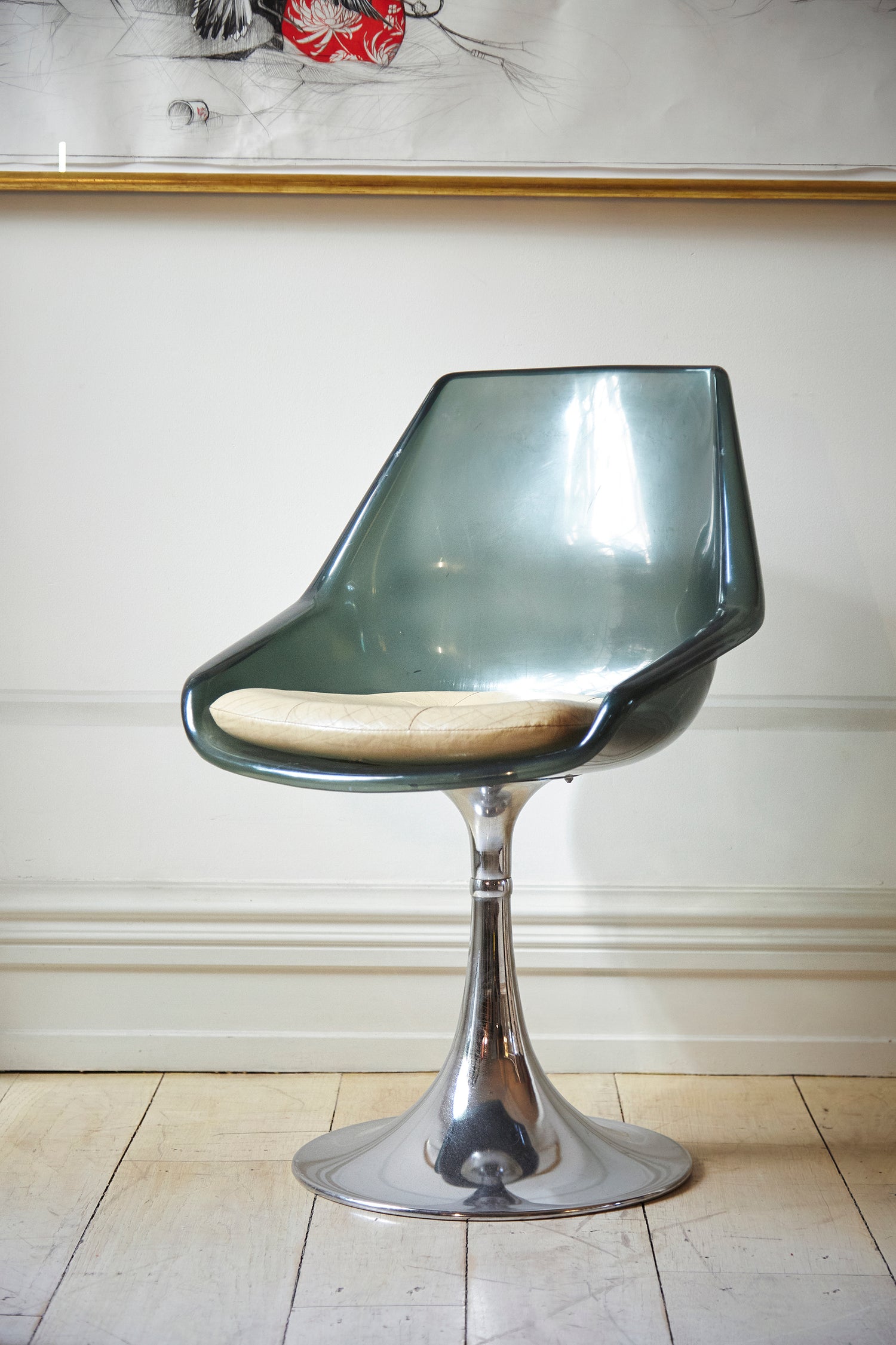 Silla de plexiglás verde con base giratoria de aluminio y almohadón de cuero en color crudo estilo tulip. Disponibilidad de tener el juego completo de cuatro sillas.