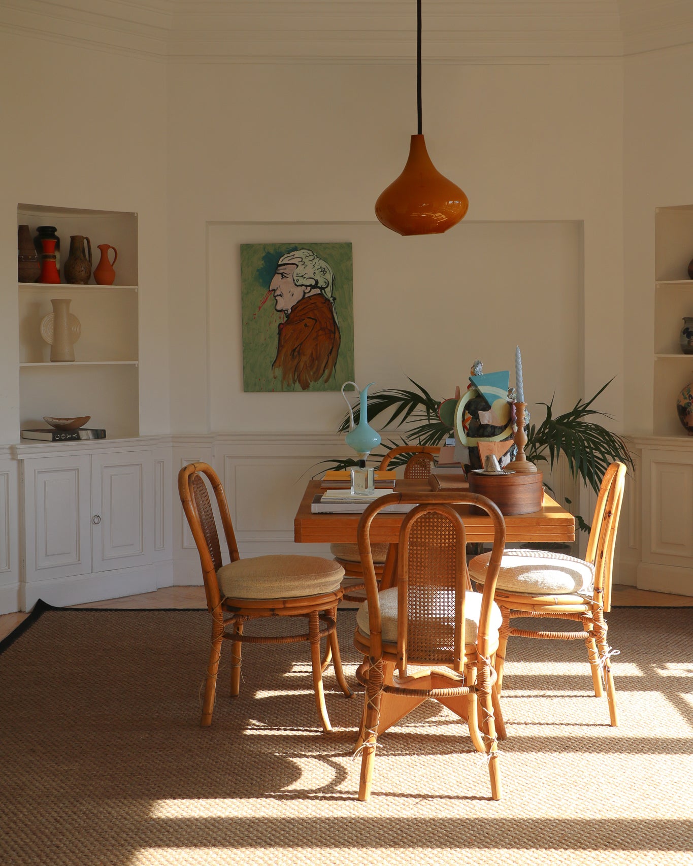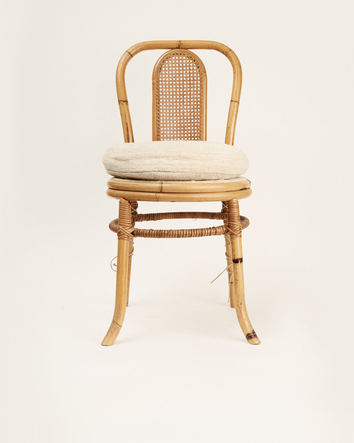 Juego de cuatro sillas vintage con estructura de ratán y almohadón en lino grueso color crudo. Provienen de París. Versátiles y con aires de bistrot.