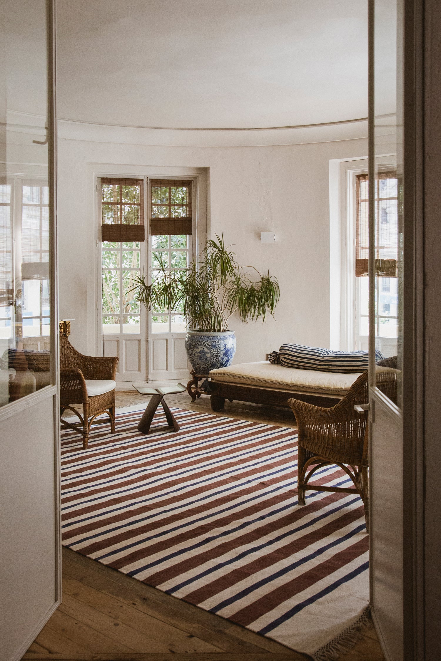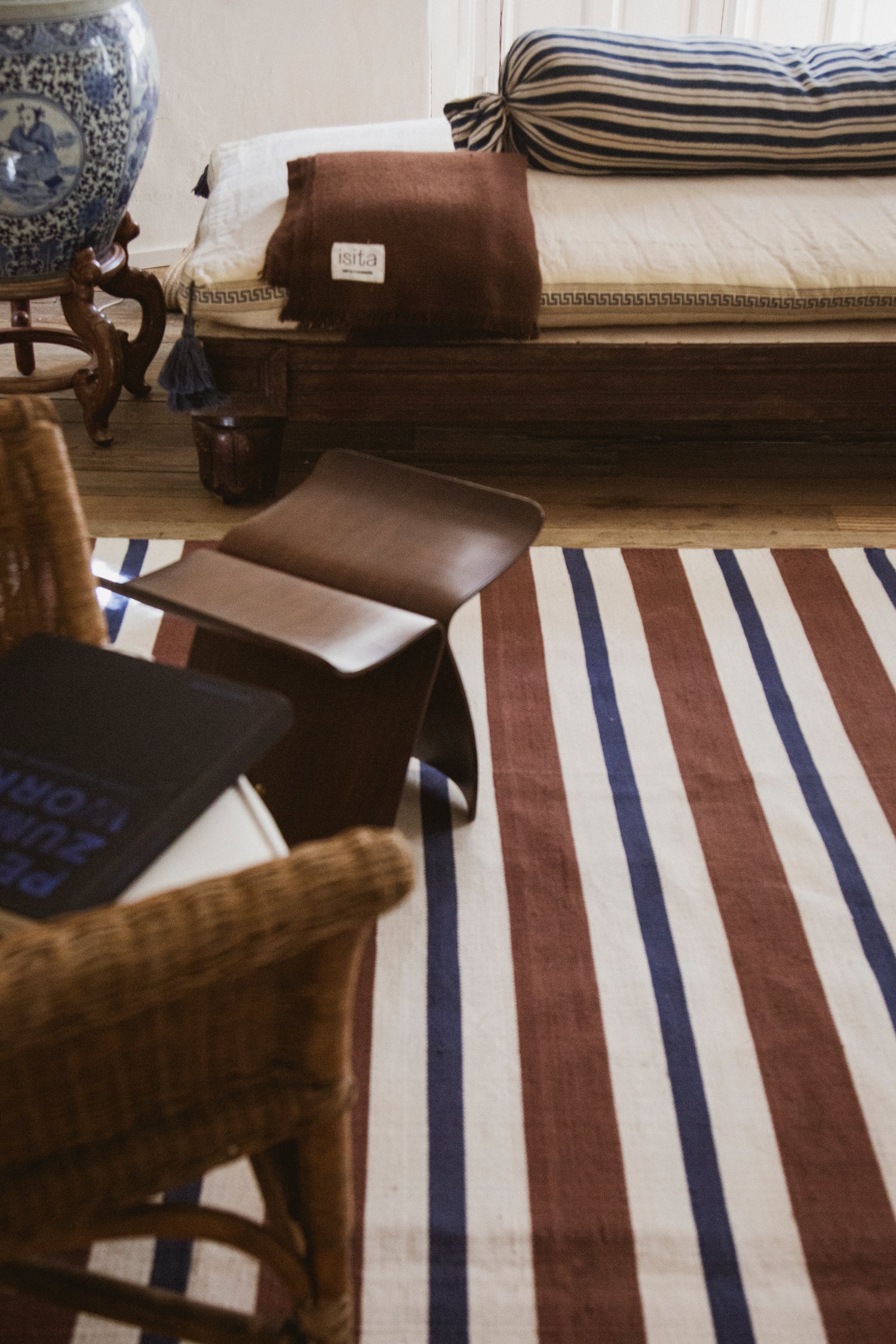 Alfombra Dhurrie hecha a mano y 100% algodón. Diseñada en nuestro estudio en Madrid y fabricada en un pueblo rural a las afueras de Bhadohi, India.