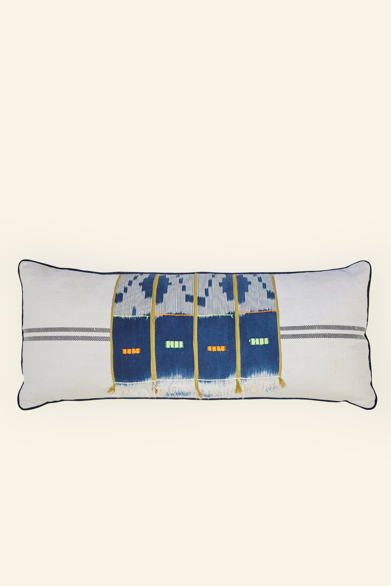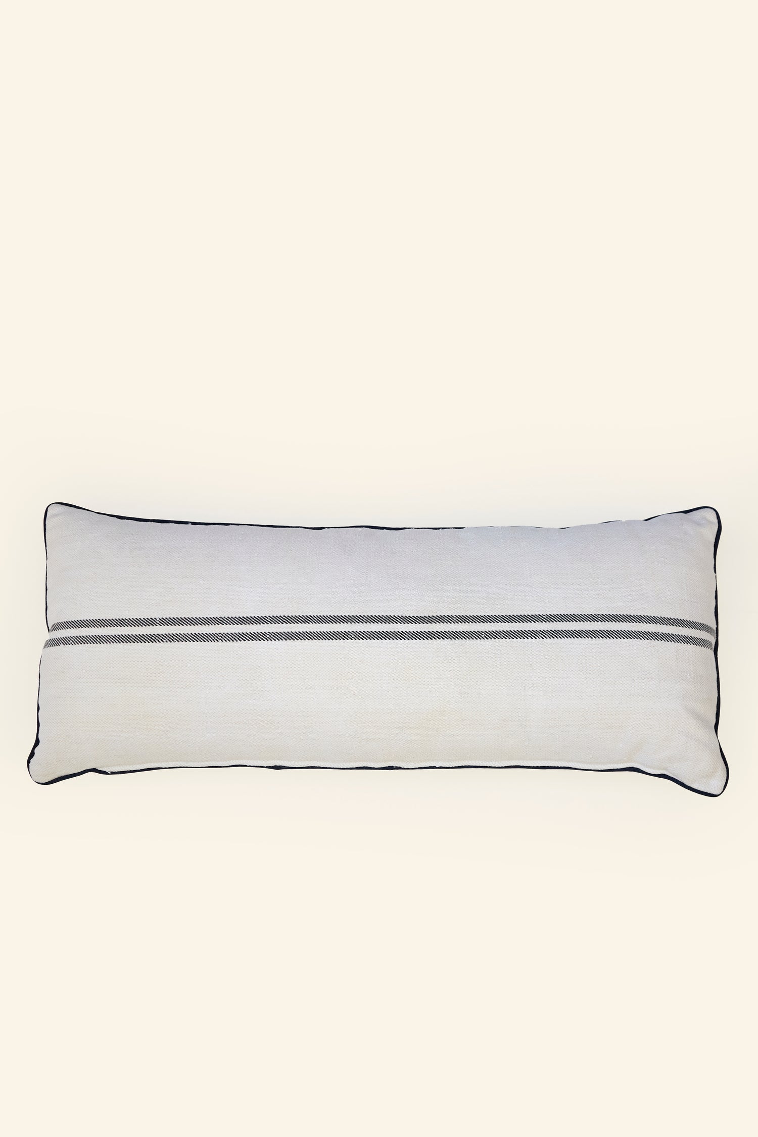 Almohadón blanco alargado en algodón con estampado étnico y trasera con una raya horizontal.