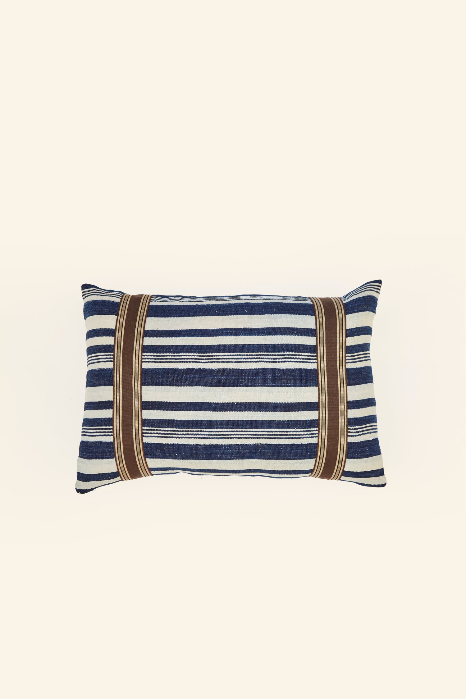 Tela antigua africana de rayas azules con dos cintas de grosgrain marrones a cada lado.