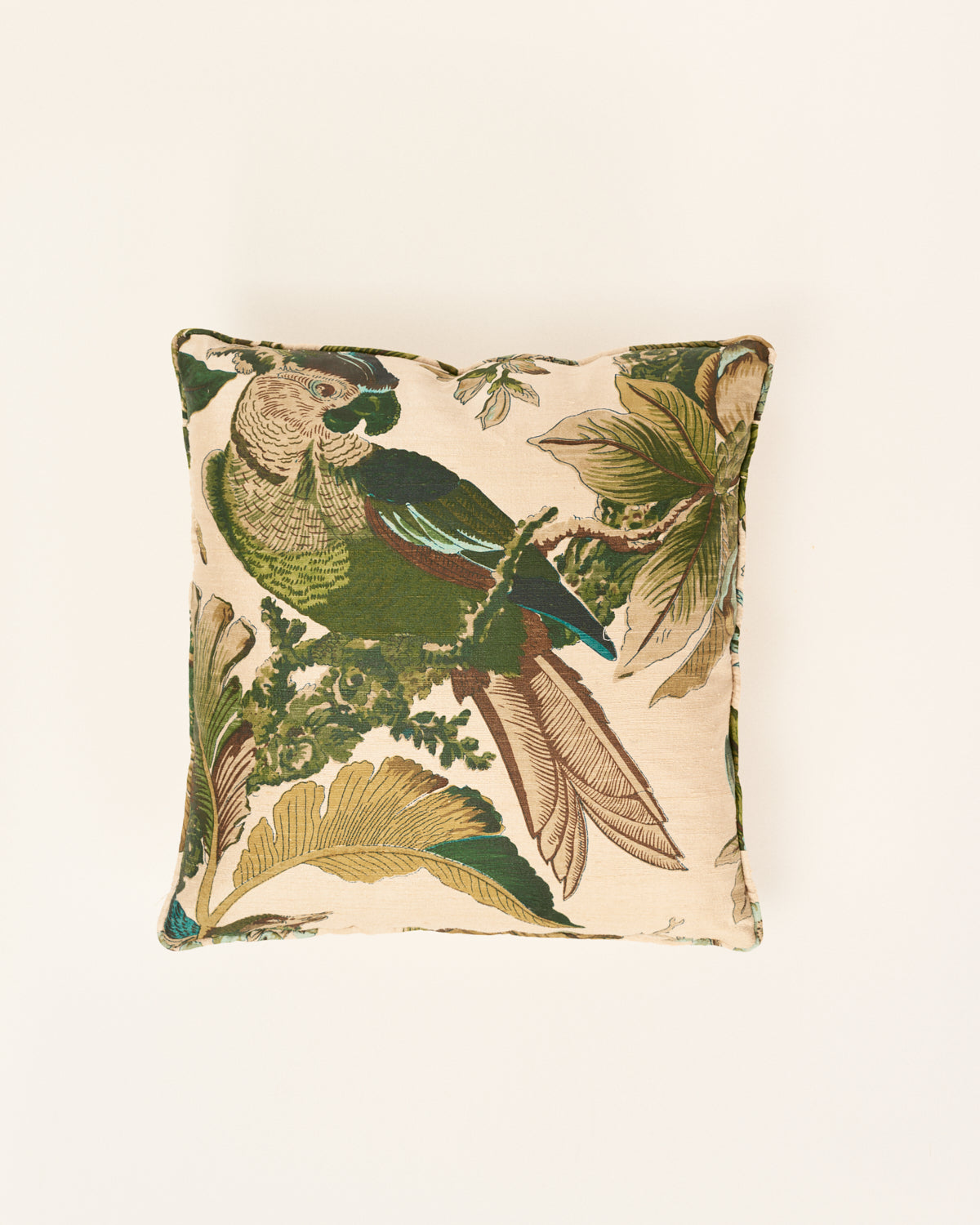 Por un lado estampado loros en seda y por el otro rayas verdes en lino.