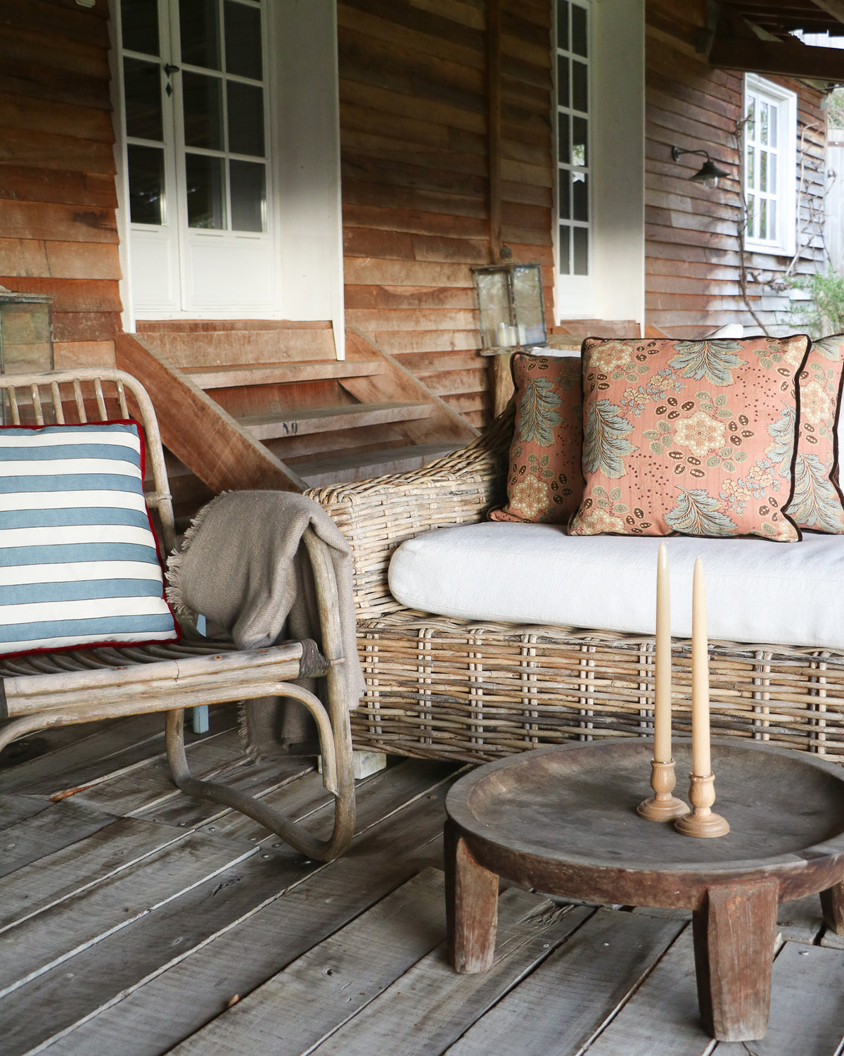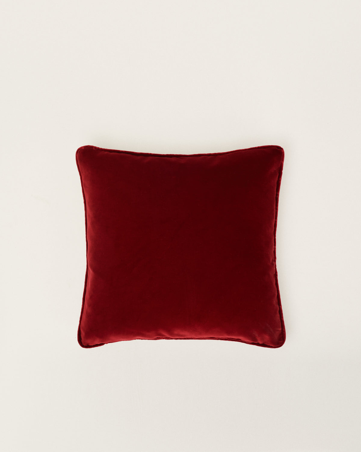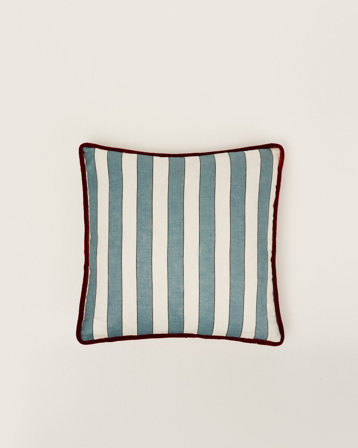 Almohadón con estampado de rayas azul y terciopelo rojo. Diseñado por Isita y confeccionado a mano en España.