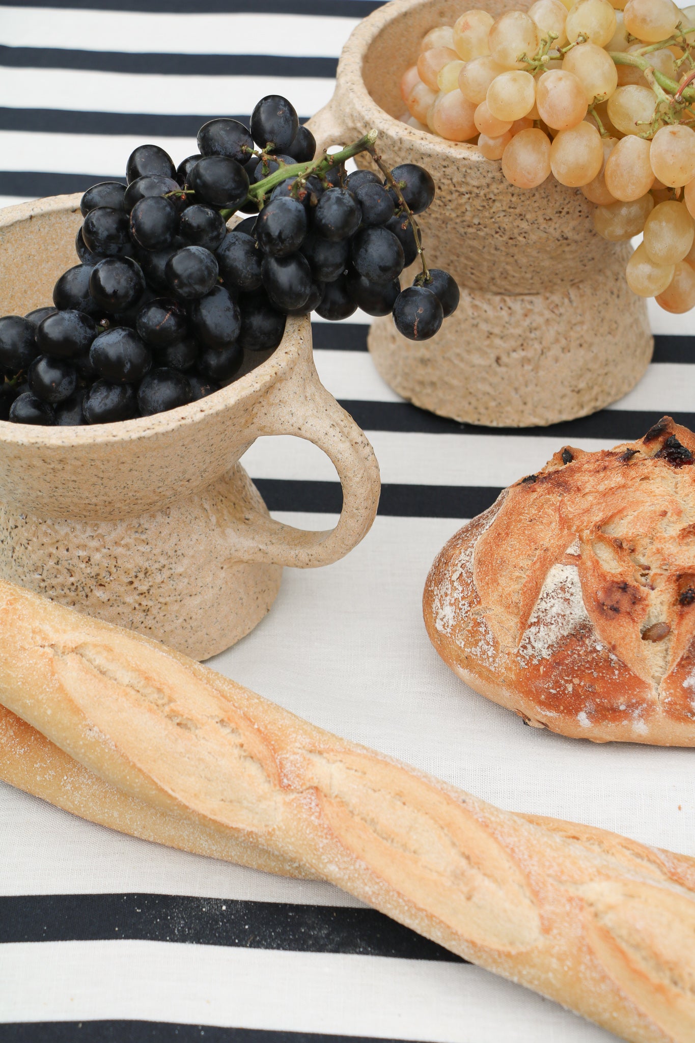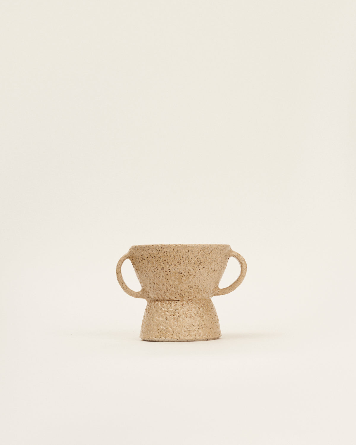 Copa de cerámica con asas moldeadas y pintada a mano por Ladio Ceramics en su taller de Ibiza, España. Diseño tradicional y mediterráneo en gres con un punto de chamota y colores naturales: blanco roto, ocre y gris. Disponible como pieza única. Se puede combinar con los otros modelos de la misma familia para componer un set. Todos son diferentes.