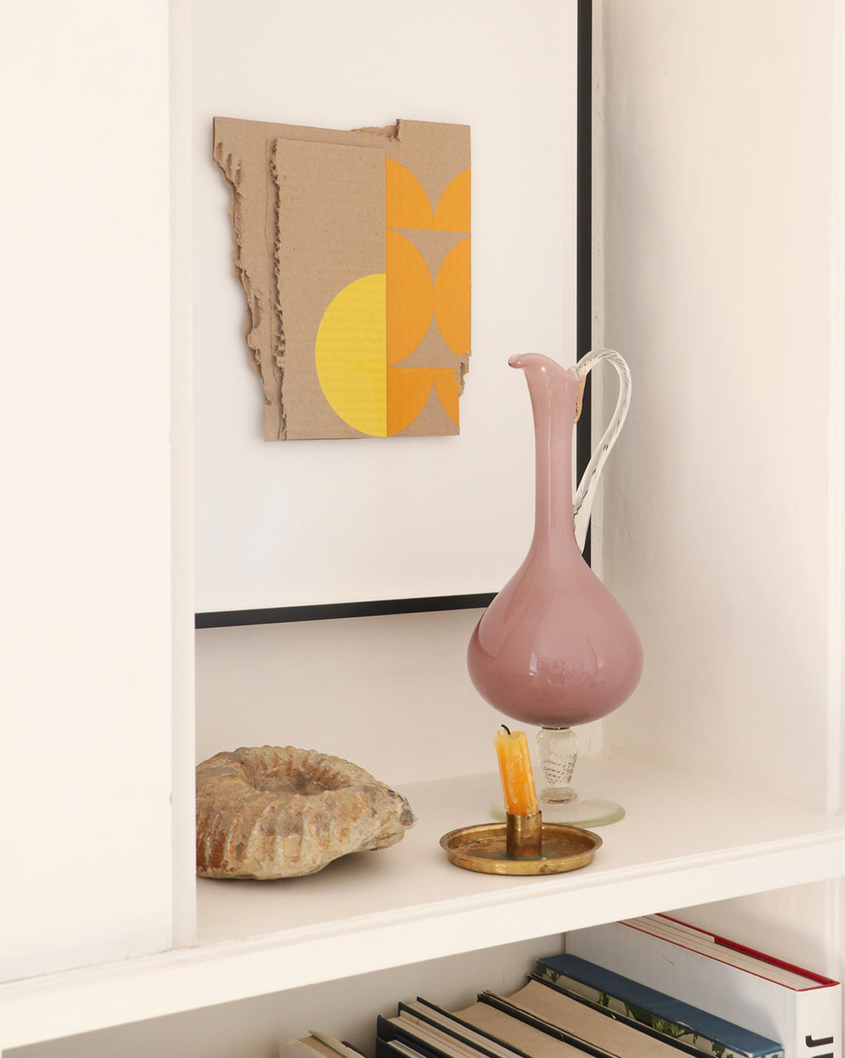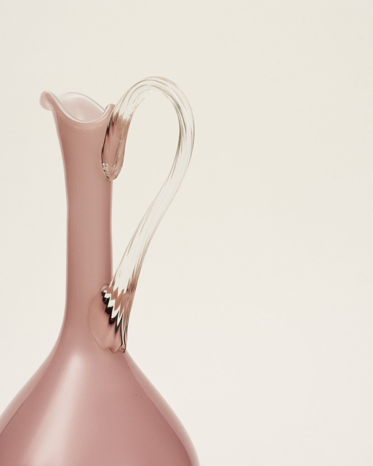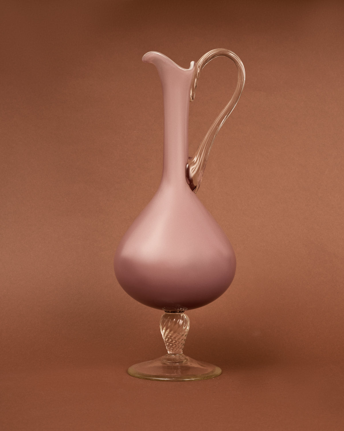 Pieza europea de opalina, segunda mitad del siglo XX, color lila apagado. Con asa y base transparentes.