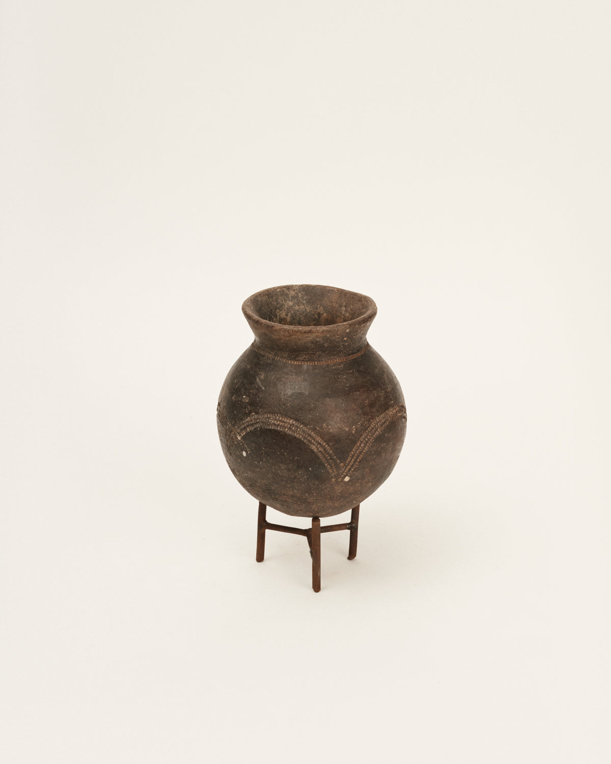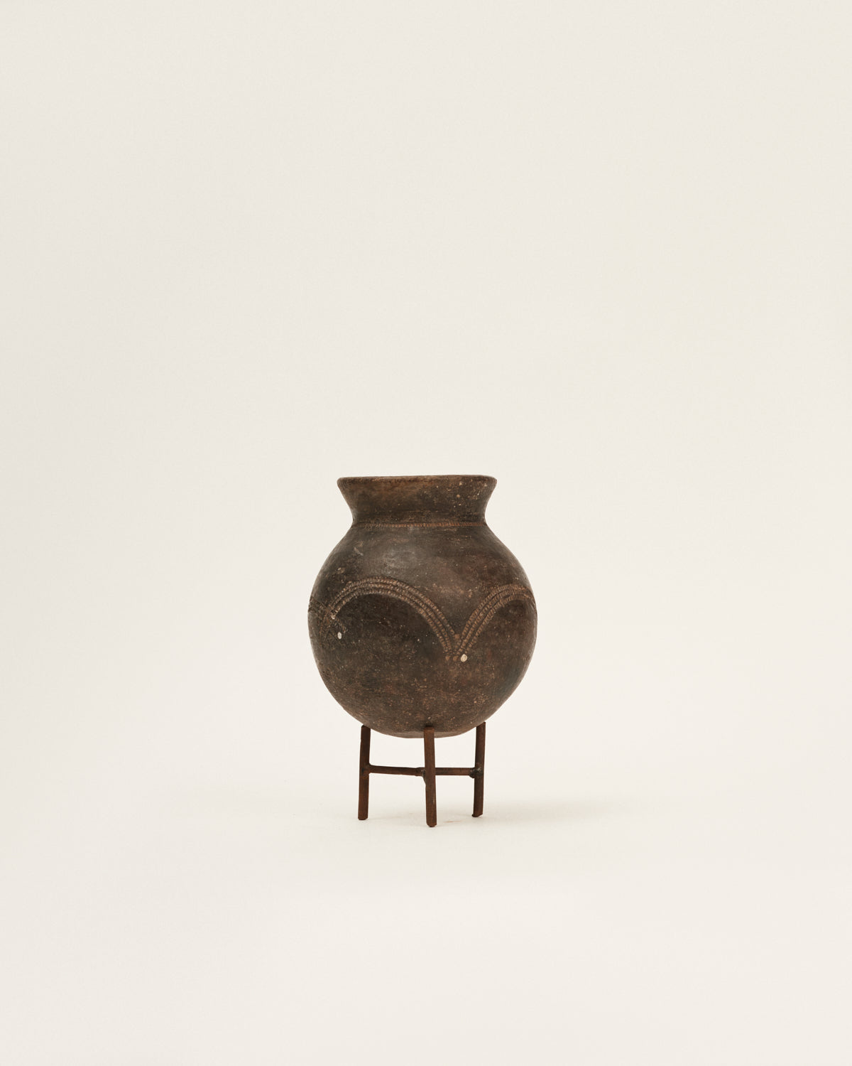 Jarrón o recipiente antiguo originario de África occidental. Pieza elaborada 100% en arcilla negra entre los siglos XII y XVI. Estas vasijas, únicas por su simplicidad, tienen varios tamaños y pueden haber sido usadas para ofrendas o simplemente utilizadas como objetos domésticos. Cada una viene con su peana, ya que su base no es plana y no se sujetan por sí mismas (esto es así porque el suelo de aquellas casas no era uniforme).