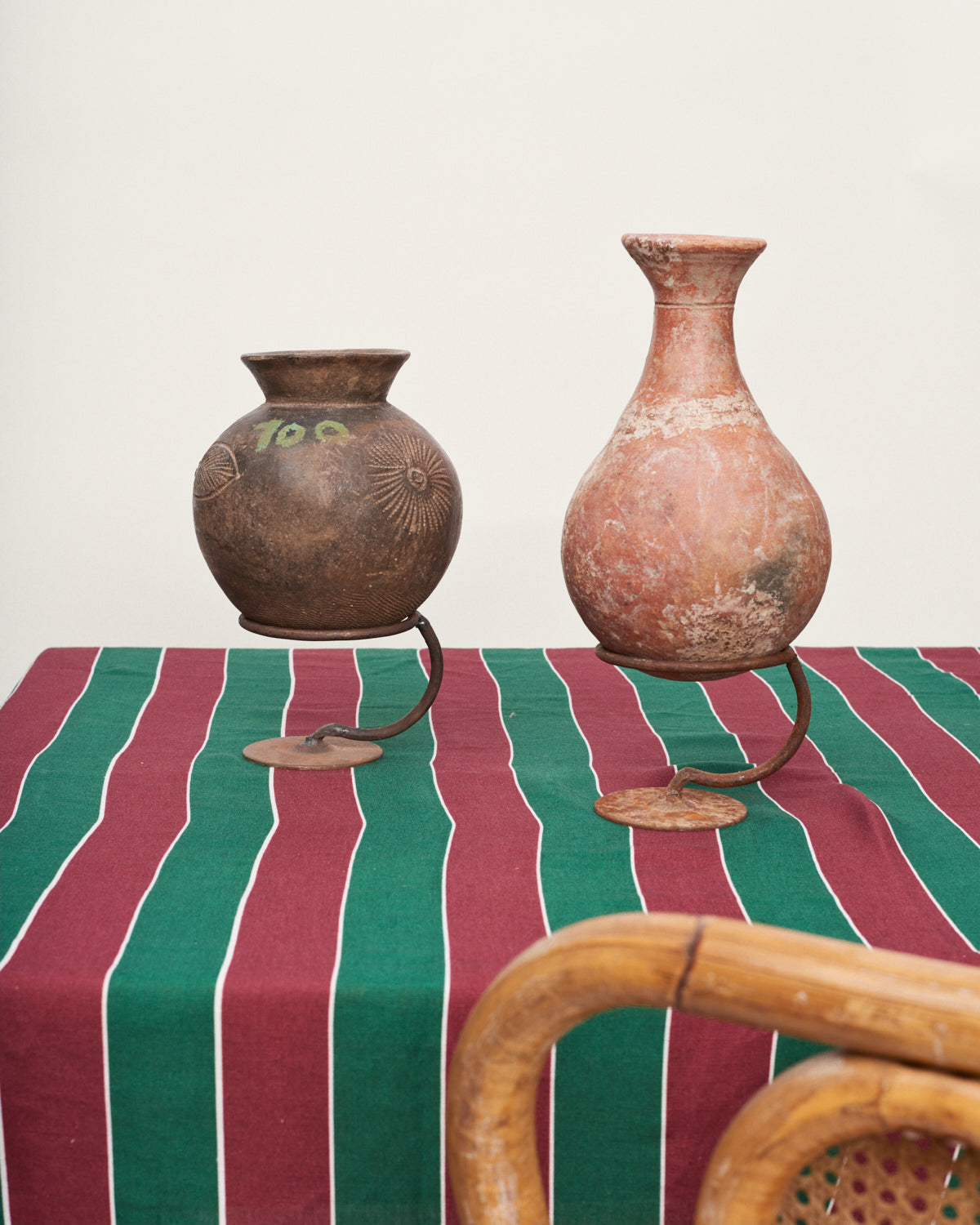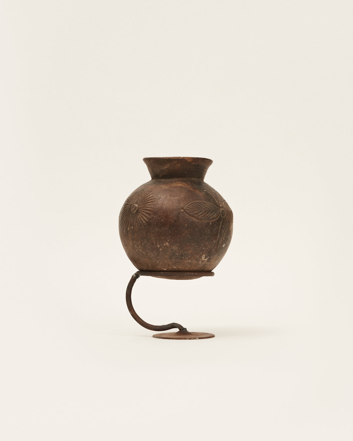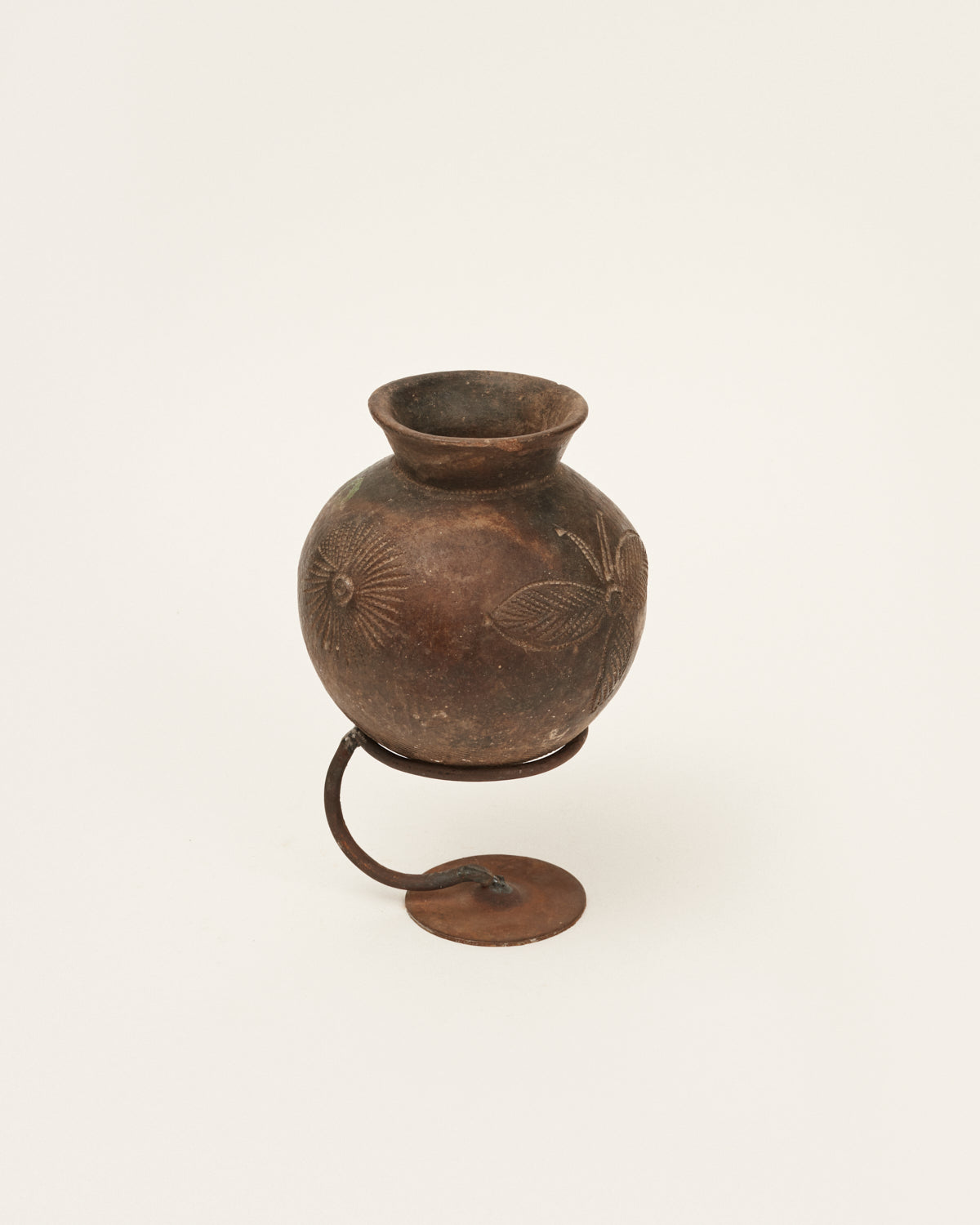 Jarrón o recipiente antiguo originario de África occidental. Pieza elaborada 100% en arcilla negra entre los siglos XII y XVI. Estas vasijas, únicas por su simplicidad, tienen varios tamaños y pueden haber sido usadas para ofrendas o simplemente utilizadas como objetos domésticos. Cada una viene con su peana, ya que su base no es plana y no se sujetan por sí mismas (esto es así porque el suelo de aquellas casas no era uniforme).
