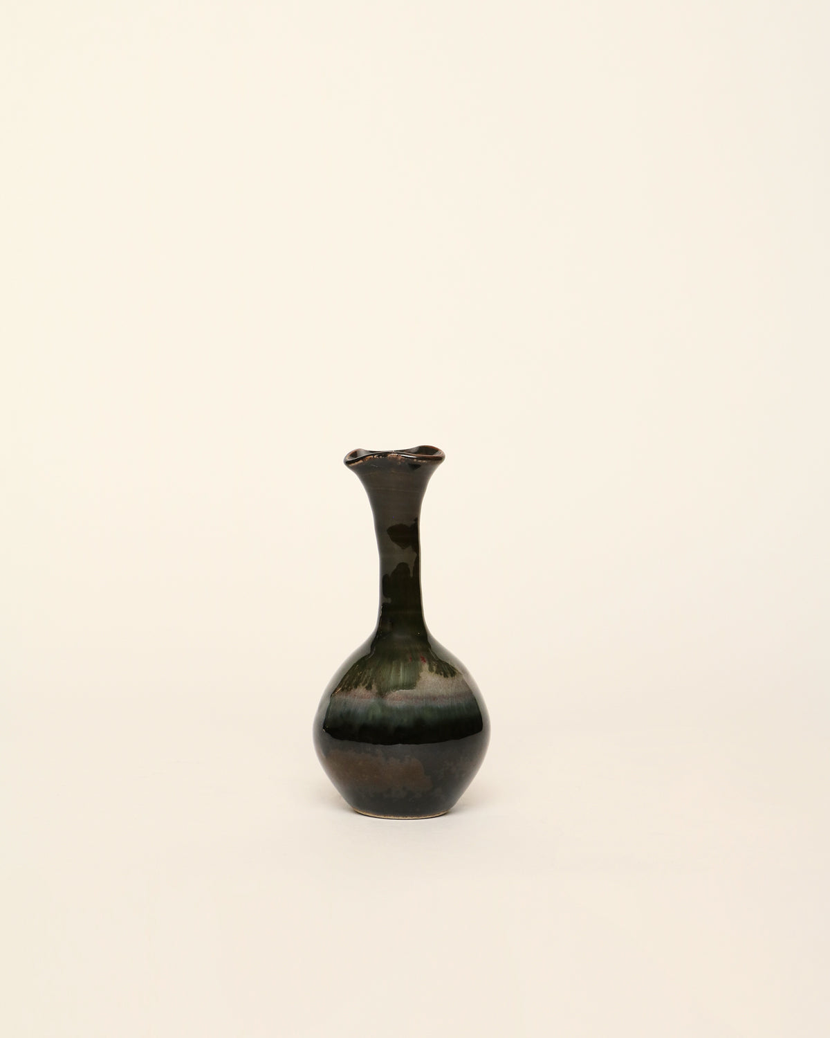 Jarrón de cerámica en tonos marrones, verdes y azules.