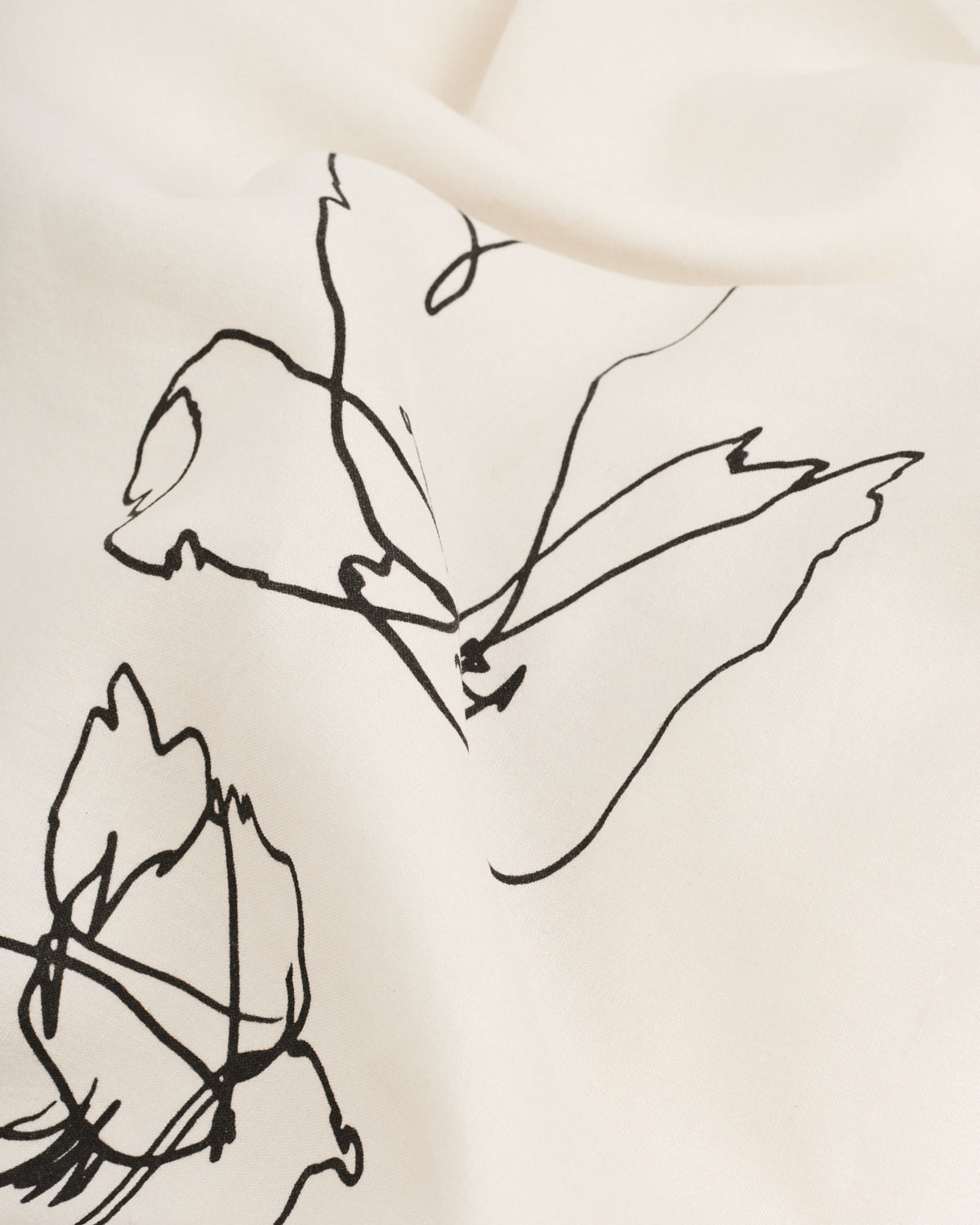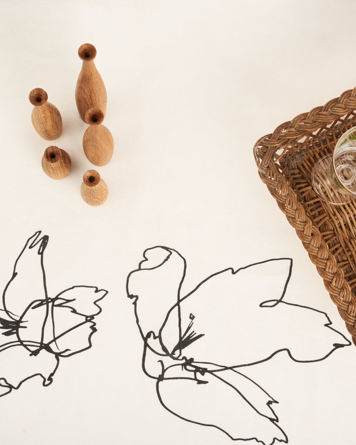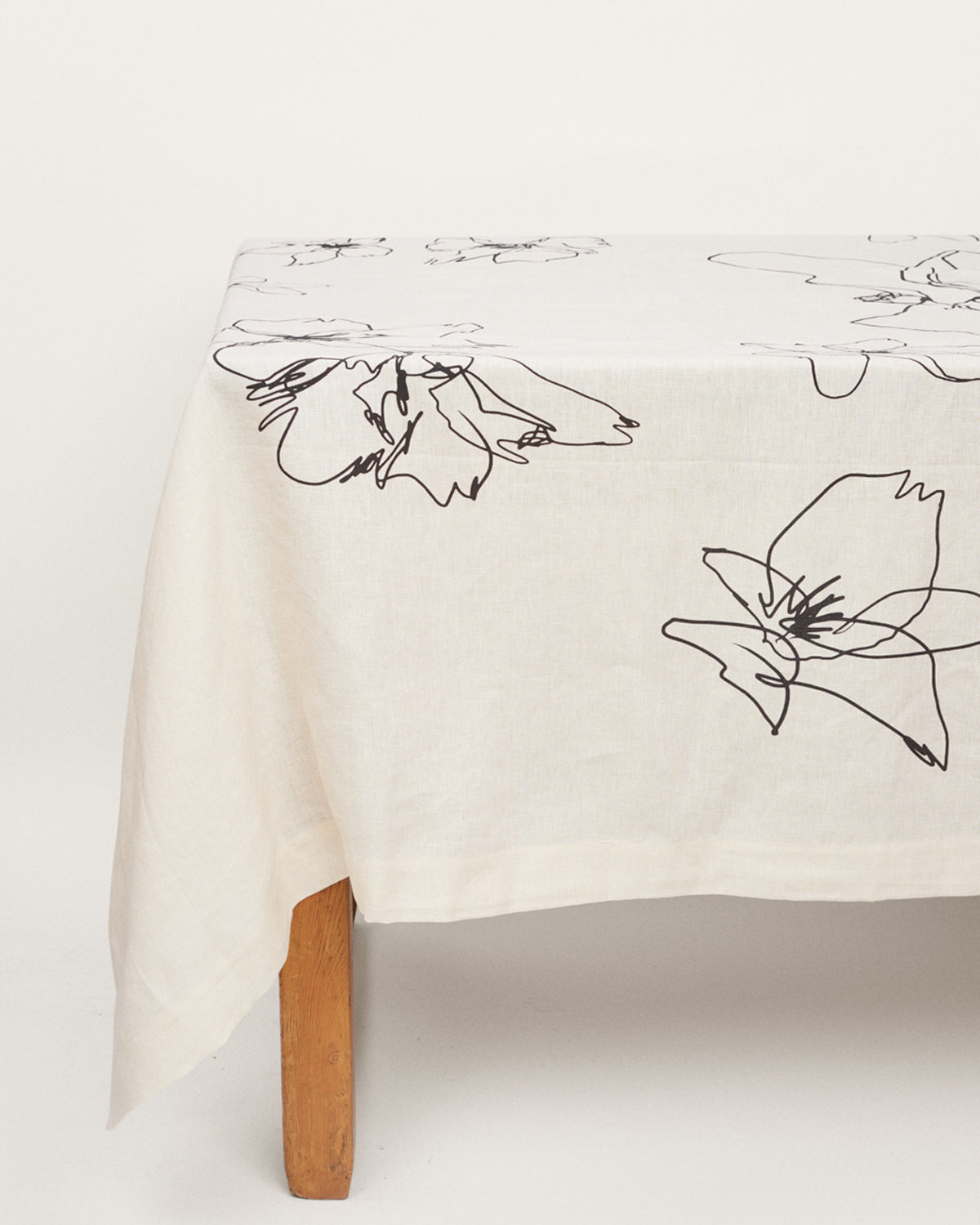 Mantel en lino 100% con estampado de lirios. Diseñado por nosotros y confeccionado en España exclusivamente para Isita con fibras de la mejor calidad. Sobre un fondo neutro, el mantel está adornado con un moderno estampado floral (previamente pintado a mano), que se adapta perfectamente a todas las comidas e interiores. Su diseño en blanco roto y negro puede utilizarse en cualquier ambiente imaginable, pero encaja perfectamente con nuestros platos de Tierra y Tiempo.