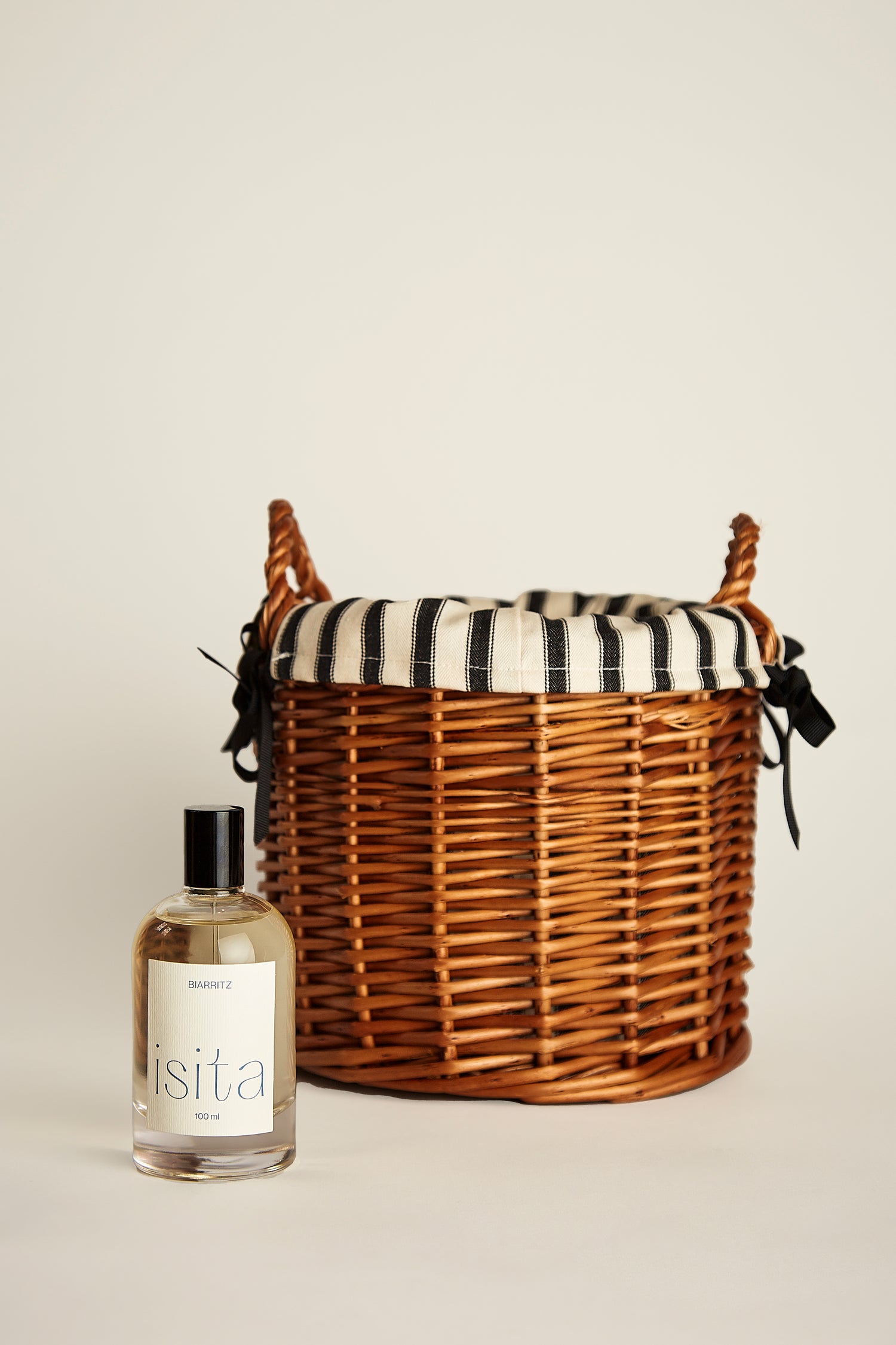 -Home spray fabricado en frasco de vidrio de 100 mL con bomba y tapón pintados a mano y etiqueta de papel vegetal. Viene en una caja de cartón con estampados diseñados por Isita.