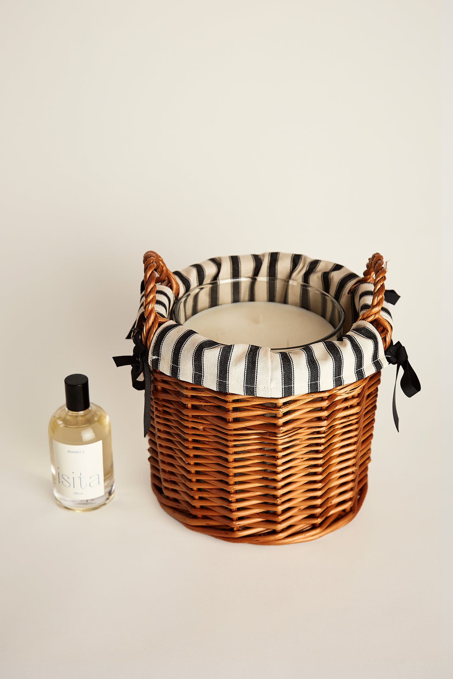 -Vela de 1,5kg de cera vegetal con tres mechas 100% de algodón rellenada a mano. El vaso de vidri está recubierto con una cesta de mimbre y una tela de rayas.