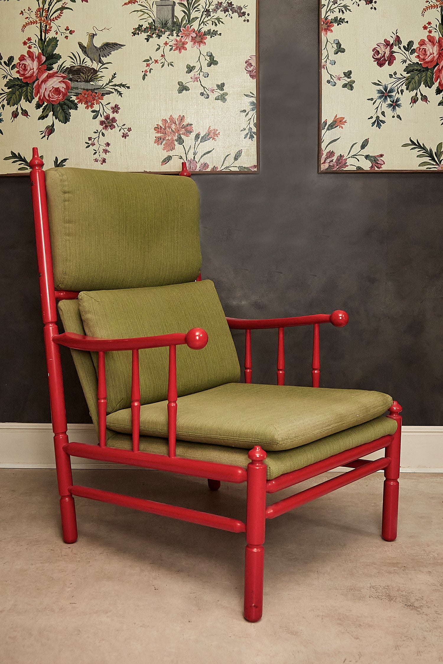 Pareja de butacas de madera lacadas en rojo y tapizadas en lino verde oliva.