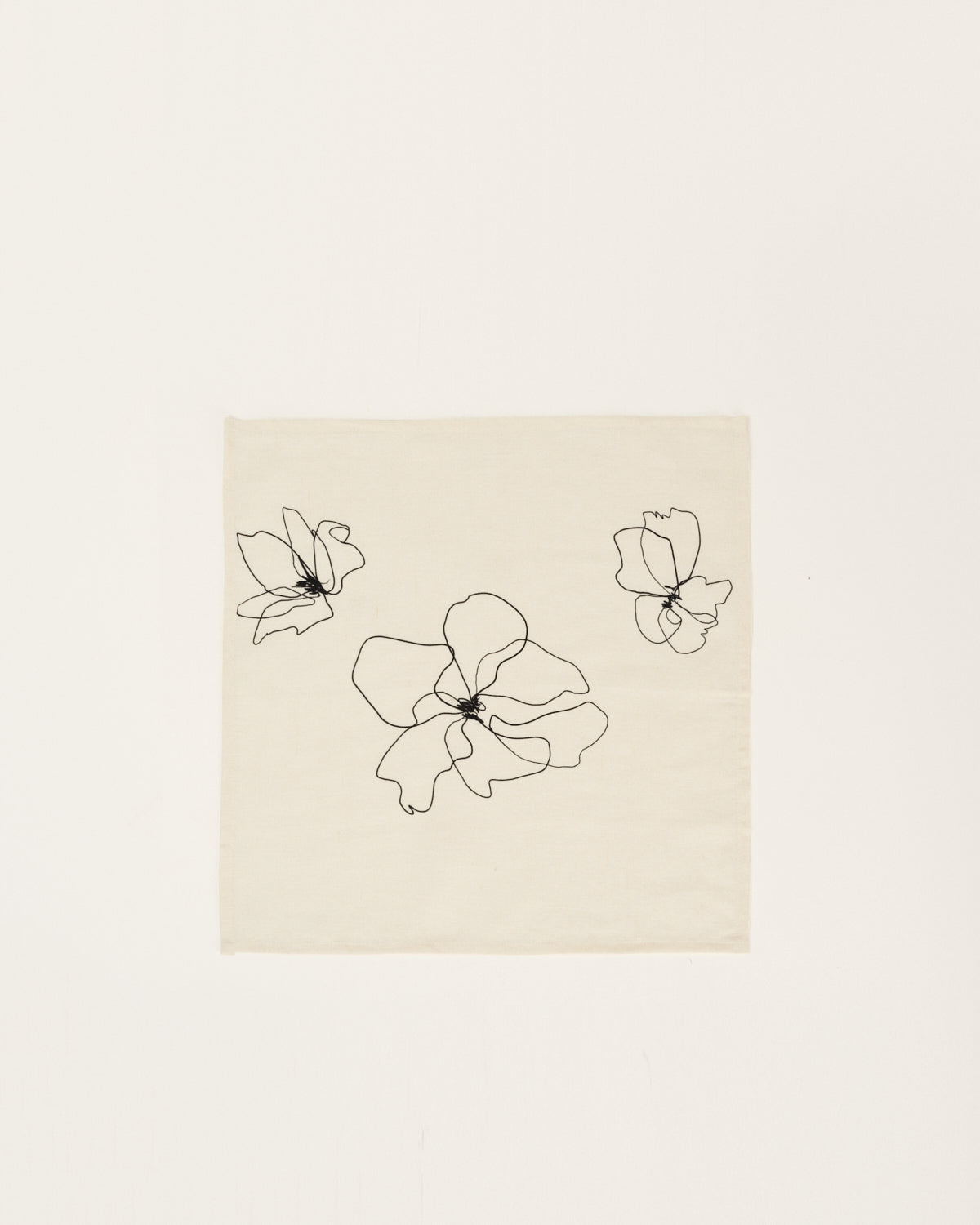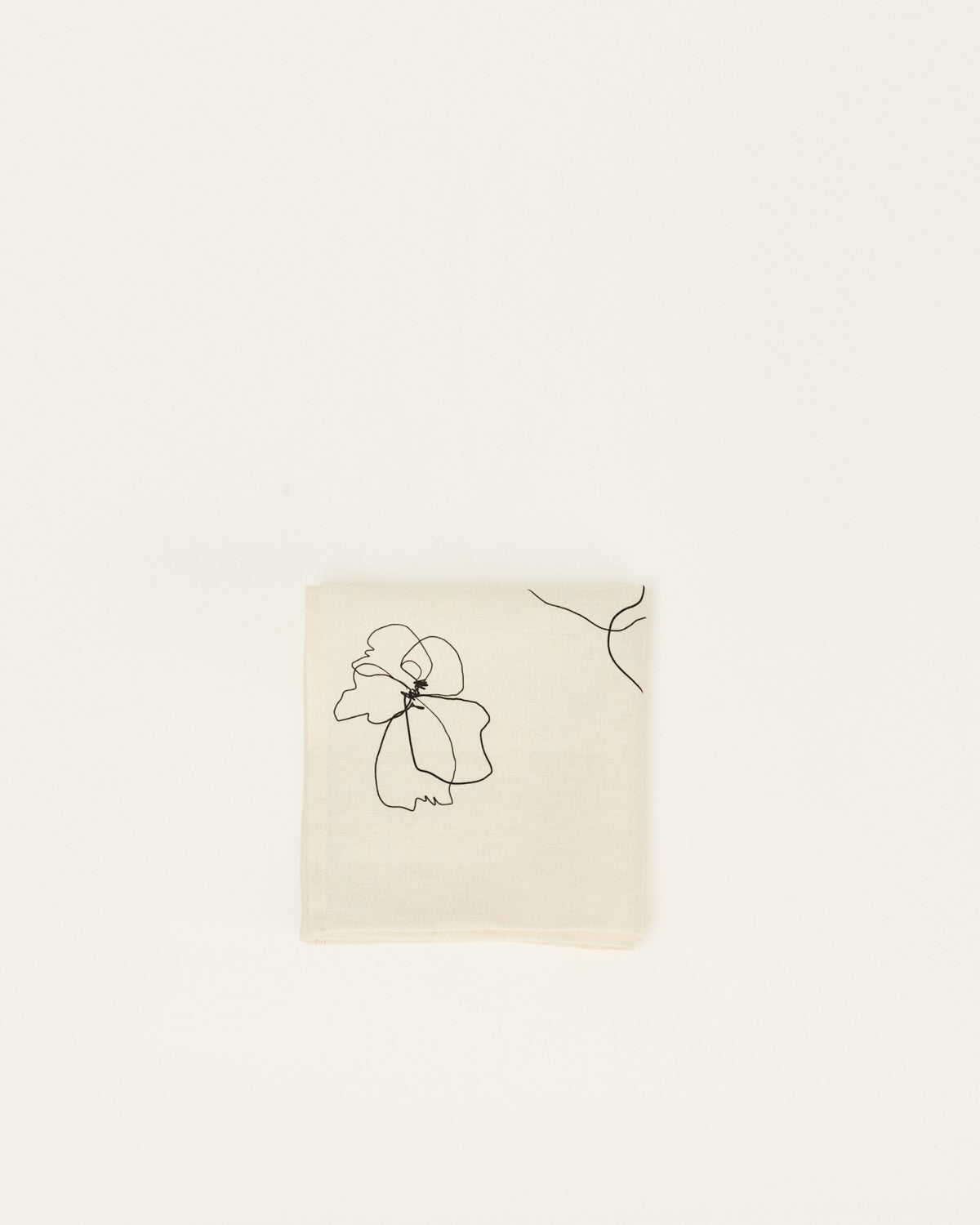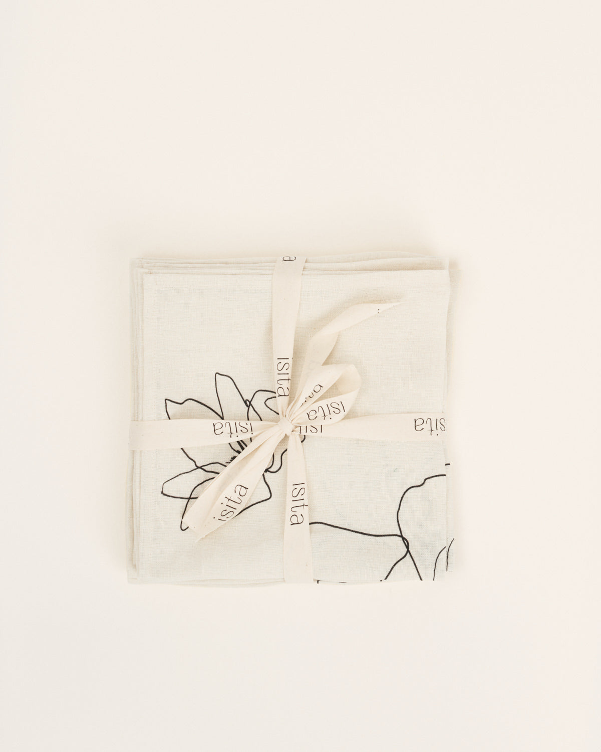 Pack de seis servilletas en lino 100% con estampado de lirios. Diseñado por nosotros y confeccionada en España exclusivamente para Isita con fibras de la mejor calidad. Sobre un fondo neutro, la servilleta está adornada con un moderno estampado floral (previamente pintado a mano), que se adapta perfectamente a todas las comidas e interiores. Su diseño en blanco roto y negro puede utilizarse en cualquier ambiente imaginable, pero encaja perfectamente con nuestros platos de Tierra y Tiempo.